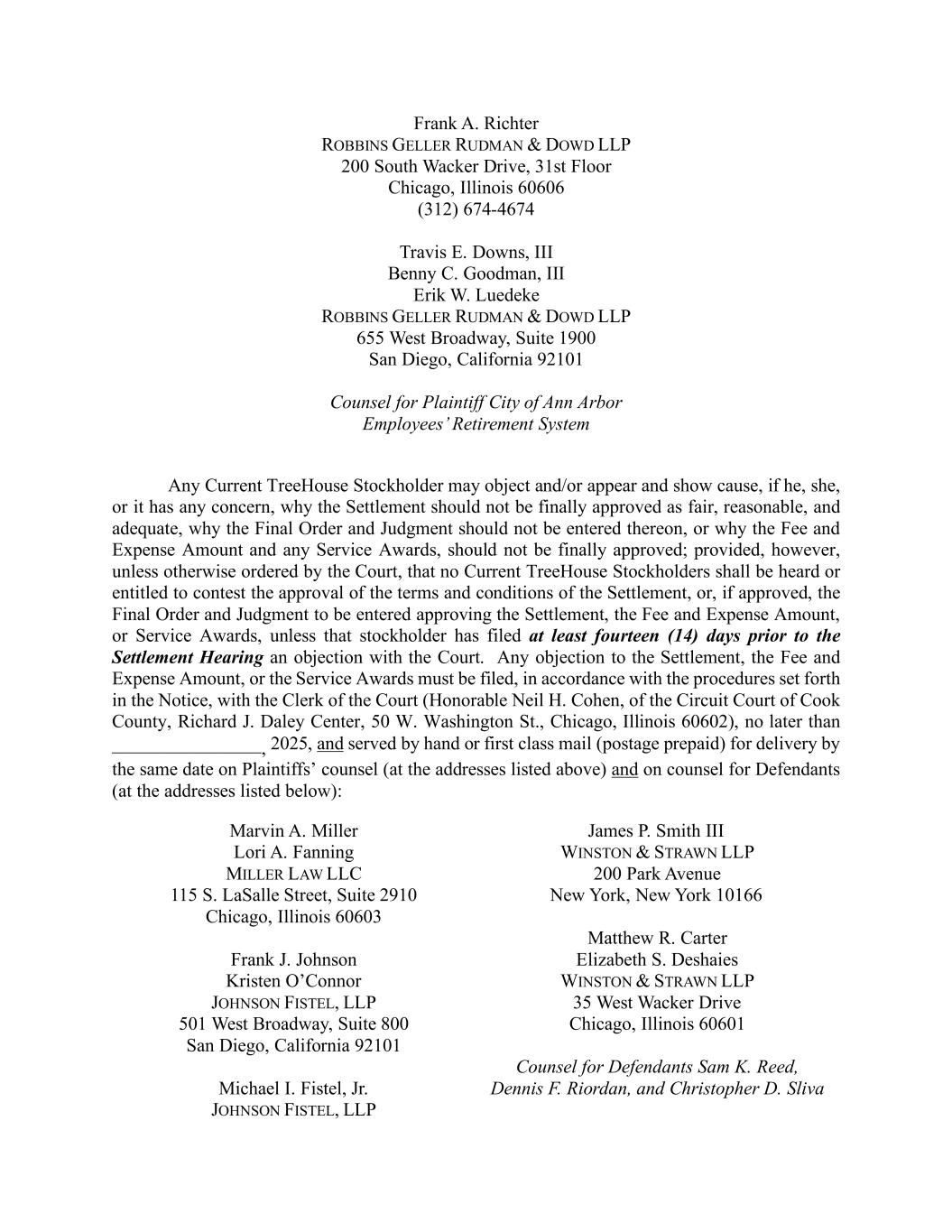 Frank A. Richter ROBBINS GELLER RUDMAN & DOWD LLP 200 South Wacker Drive, 31st Floor Chicago, Illinois 60606 (312) 674-4674 Travis E. Downs, III Benny C. Goodman, III Erik W. Luedeke ROBBINS GELLER RUDMAN & DOWD LLP 655 West Broadway, Suite 1900 San Diego, California 92101 Counsel for Plaintiff City of Ann Arbor Employees’ Retirement System Any Current TreeHouse Stockholder may object and/or appear and show cause, if he, she, or it has any concern, why the Settlement should not be finally approved as fair, reasonable, and adequate, why the Final Order and Judgment should not be entered thereon, or why the Fee and Expense Amount and any Service Awards, should not be finally approved; provided, however, unless otherwise ordered by the Court, that no Current TreeHouse Stockholders shall be heard or entitled to contest the approval of the terms and conditions of the Settlement, or, if approved, the Final Order and Judgment to be entered approving the Settlement, the Fee and Expense Amount, or Service Awards, unless that stockholder has filed at least fourteen (14) days prior to the Settlement Hearing an objection with the Court. Any objection to the Settlement, the Fee and Expense Amount, or the Service Awards must be filed, in accordance with the procedures set forth in the Notice, with the Clerk of the Court (Honorable Neil H. Cohen, of the Circuit Court of Cook County, Richard J. Daley Center, 50 W. Washington St., Chicago, Illinois 60602), no later than ________________, 2025, and served by hand or first class mail (postage prepaid) for delivery by the same date on Plaintiffs’ counsel (at the addresses listed above) and on counsel for Defendants (at the addresses listed below): Marvin A. Miller Lori A. Fanning MILLER LAW LLC 115 S. LaSalle Street, Suite 2910 Chicago, Illinois 60603 Frank J. Johnson Kristen O’Connor JOHNSON FISTEL, LLP 501 West Broadway, Suite 800 San Diego, California 92101 Michael I. Fistel, Jr. JOHNSON FISTEL, LLP James P. Smith III WINSTON & STRAWN LLP 200 Park Avenue New York, New York 10166 Matthew R. Carter Elizabeth S. Deshaies WINSTON & STRAWN LLP 35 West Wacker Drive Chicago, Illinois 60601 Counsel for Defendants Sam K. Reed, Dennis F. Riordan, and Christopher D. Sliva