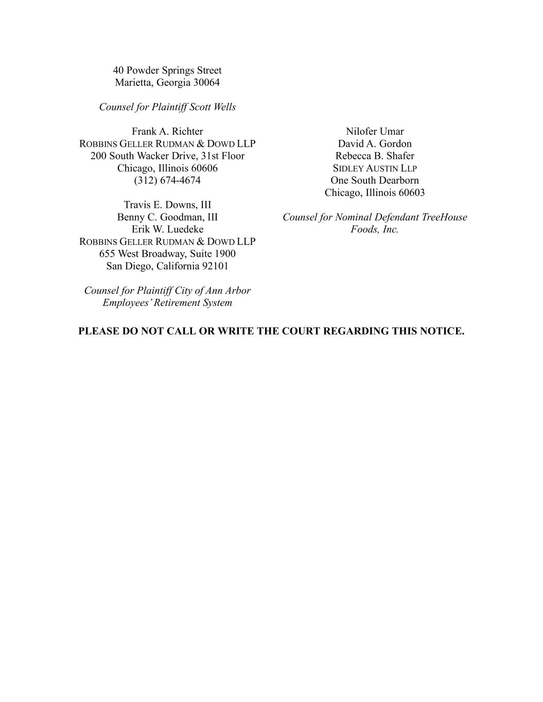 40 Powder Springs Street Marietta, Georgia 30064 Counsel for Plaintiff Scott Wells Frank A. Richter ROBBINS GELLER RUDMAN & DOWD LLP 200 South Wacker Drive, 31st Floor Chicago, Illinois 60606 (312) 674-4674 Travis E. Downs, III Benny C. Goodman, III Erik W. Luedeke ROBBINS GELLER RUDMAN & DOWD LLP 655 West Broadway, Suite 1900 San Diego, California 92101 Counsel for Plaintiff City of Ann Arbor Employees’ Retirement System Nilofer Umar David A. Gordon Rebecca B. Shafer SIDLEY AUSTIN LLP One South Dearborn Chicago, Illinois 60603 Counsel for Nominal Defendant TreeHouse Foods, Inc. PLEASE DO NOT CALL OR WRITE THE COURT REGARDING THIS NOTICE.