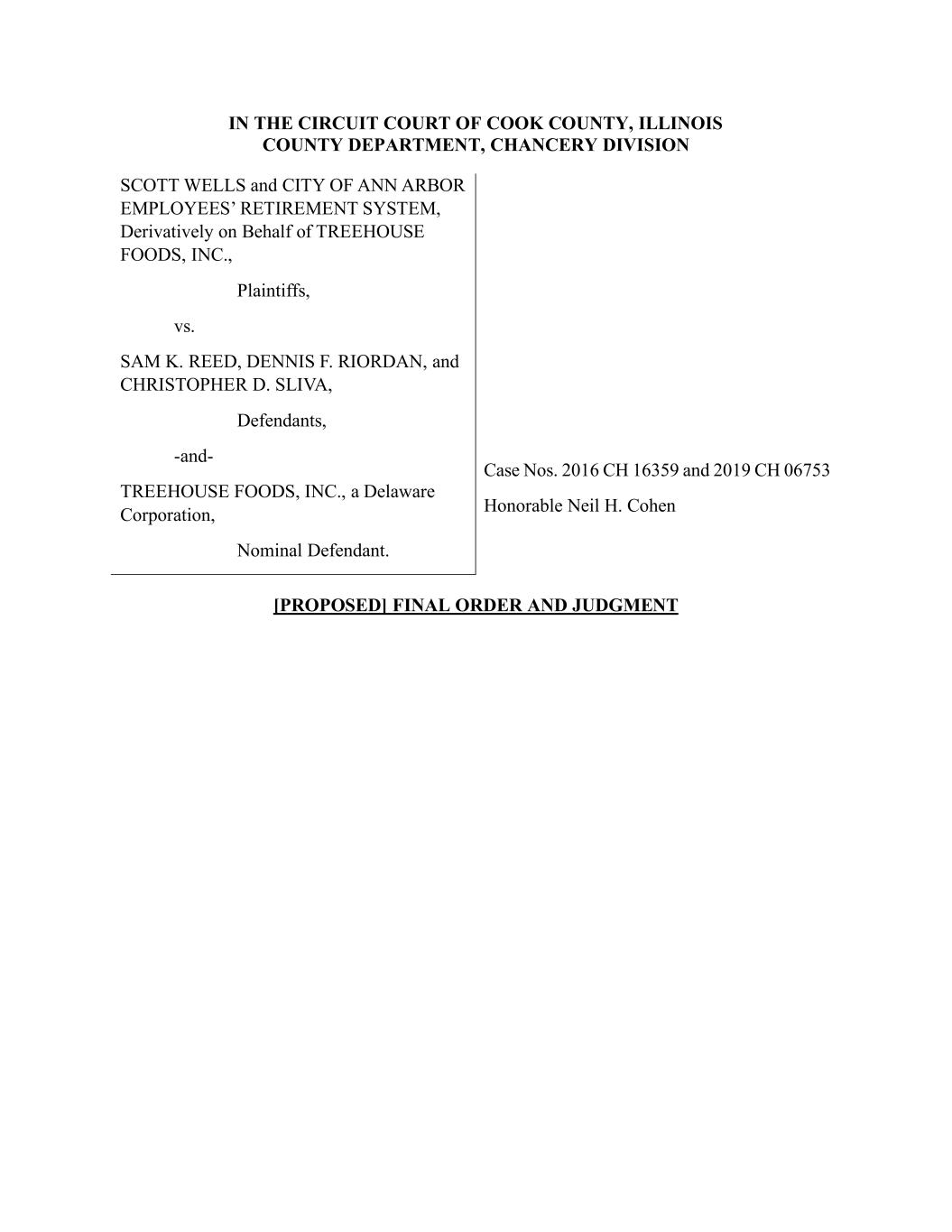 IN THE CIRCUIT COURT OF COOK COUNTY, ILLINOIS COUNTY DEPARTMENT, CHANCERY DIVISION SCOTT WELLS and CITY OF ANN ARBOR EMPLOYEES’ RETIREMENT SYSTEM, Derivatively on Behalf of TREEHOUSE FOODS, INC., Plaintiffs, vs. SAM K. REED, DENNIS F. RIORDAN, and CHRISTOPHER D. SLIVA, Defendants, -and- TREEHOUSE FOODS, INC., a Delaware Corporation, Nominal Defendant. Case Nos. 2016 CH 16359 and 2019 CH 06753 Honorable Neil H. Cohen [PROPOSED] FINAL ORDER AND JUDGMENT