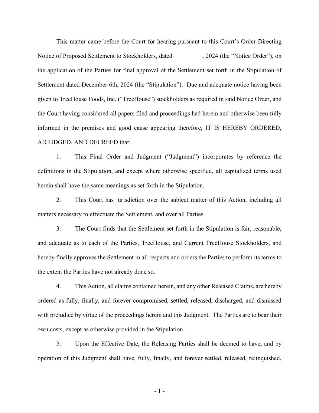 - 1 - This matter came before the Court for hearing pursuant to this Court’s Order Directing Notice of Proposed Settlement to Stockholders, dated _________, 2024 (the “Notice Order”), on the application of the Parties for final approval of the Settlement set forth in the Stipulation of Settlement dated December 6th, 2024 (the “Stipulation”). Due and adequate notice having been given to TreeHouse Foods, Inc. (“TreeHouse”) stockholders as required in said Notice Order, and the Court having considered all papers filed and proceedings had herein and otherwise been fully informed in the premises and good cause appearing therefore, IT IS HEREBY ORDERED, ADJUDGED, AND DECREED that: 1. This Final Order and Judgment (“Judgment”) incorporates by reference the definitions in the Stipulation, and except where otherwise specified, all capitalized terms used herein shall have the same meanings as set forth in the Stipulation. 2. This Court has jurisdiction over the subject matter of this Action, including all matters necessary to effectuate the Settlement, and over all Parties. 3. The Court finds that the Settlement set forth in the Stipulation is fair, reasonable, and adequate as to each of the Parties, TreeHouse, and Current TreeHouse Stockholders, and hereby finally approves the Settlement in all respects and orders the Parties to perform its terms to the extent the Parties have not already done so. 4. This Action, all claims contained herein, and any other Released Claims, are hereby ordered as fully, finally, and forever compromised, settled, released, discharged, and dismissed with prejudice by virtue of the proceedings herein and this Judgment. The Parties are to bear their own costs, except as otherwise provided in the Stipulation. 5. Upon the Effective Date, the Releasing Parties shall be deemed to have, and by operation of this Judgment shall have, fully, finally, and forever settled, released, relinquished,