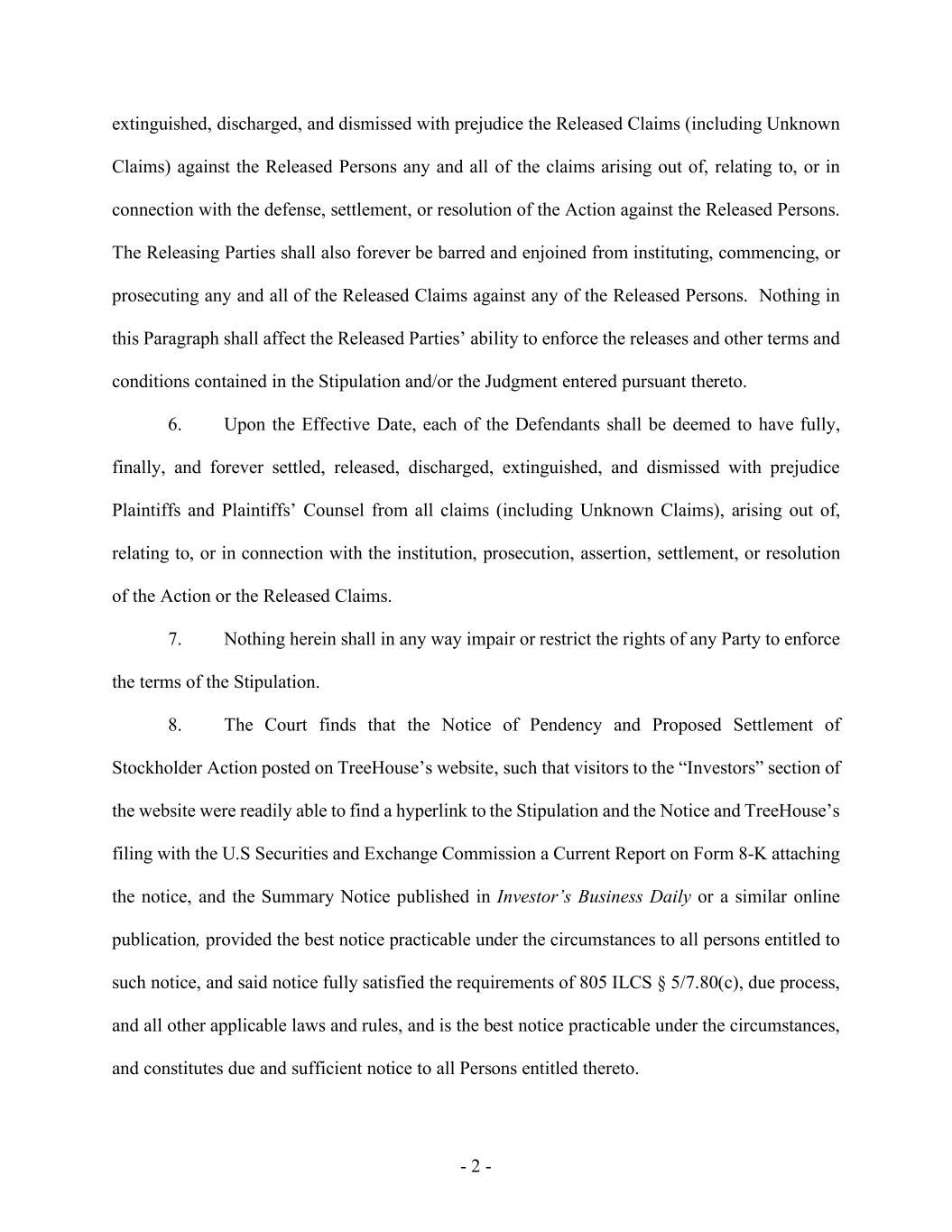 - 2 - extinguished, discharged, and dismissed with prejudice the Released Claims (including Unknown Claims) against the Released Persons any and all of the claims arising out of, relating to, or in connection with the defense, settlement, or resolution of the Action against the Released Persons. The Releasing Parties shall also forever be barred and enjoined from instituting, commencing, or prosecuting any and all of the Released Claims against any of the Released Persons. Nothing in this Paragraph shall affect the Released Parties’ ability to enforce the releases and other terms and conditions contained in the Stipulation and/or the Judgment entered pursuant thereto. 6. Upon the Effective Date, each of the Defendants shall be deemed to have fully, finally, and forever settled, released, discharged, extinguished, and dismissed with prejudice Plaintiffs and Plaintiffs’ Counsel from all claims (including Unknown Claims), arising out of, relating to, or in connection with the institution, prosecution, assertion, settlement, or resolution of the Action or the Released Claims. 7. Nothing herein shall in any way impair or restrict the rights of any Party to enforce the terms of the Stipulation. 8. The Court finds that the Notice of Pendency and Proposed Settlement of Stockholder Action posted on TreeHouse’s website, such that visitors to the “Investors” section of the website were readily able to find a hyperlink to the Stipulation and the Notice and TreeHouse’s filing with the U.S Securities and Exchange Commission a Current Report on Form 8-K attaching the notice, and the Summary Notice published in Investor’s Business Daily or a similar online publication, provided the best notice practicable under the circumstances to all persons entitled to such notice, and said notice fully satisfied the requirements of 805 ILCS § 5/7.80(c), due process, and all other applicable laws and rules, and is the best notice practicable under the circumstances, and constitutes due and sufficient notice to all Persons entitled thereto.