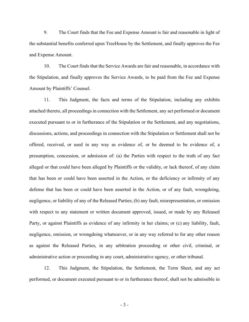 - 3 - 9. The Court finds that the Fee and Expense Amount is fair and reasonable in light of the substantial benefits conferred upon TreeHouse by the Settlement, and finally approves the Fee and Expense Amount. 10. The Court finds that the Service Awards are fair and reasonable, in accordance with the Stipulation, and finally approves the Service Awards, to be paid from the Fee and Expense Amount by Plaintiffs’ Counsel. 11. This Judgment, the facts and terms of the Stipulation, including any exhibits attached thereto, all proceedings in connection with the Settlement, any act performed or document executed pursuant to or in furtherance of the Stipulation or the Settlement, and any negotiations, discussions, actions, and proceedings in connection with the Stipulation or Settlement shall not be offered, received, or used in any way as evidence of, or be deemed to be evidence of, a presumption, concession, or admission of: (a) the Parties with respect to the truth of any fact alleged or that could have been alleged by Plaintiffs or the validity, or lack thereof, of any claim that has been or could have been asserted in the Action, or the deficiency or infirmity of any defense that has been or could have been asserted in the Action, or of any fault, wrongdoing, negligence, or liability of any of the Released Parties; (b) any fault, misrepresentation, or omission with respect to any statement or written document approved, issued, or made by any Released Party, or against Plaintiffs as evidence of any infirmity in her claims; or (c) any liability, fault, negligence, omission, or wrongdoing whatsoever, or in any way referred to for any other reason as against the Released Parties, in any arbitration proceeding or other civil, criminal, or administrative action or proceeding in any court, administrative agency, or other tribunal. 12. This Judgment, the Stipulation, the Settlement, the Term Sheet, and any act performed, or document executed pursuant to or in furtherance thereof, shall not be admissible in