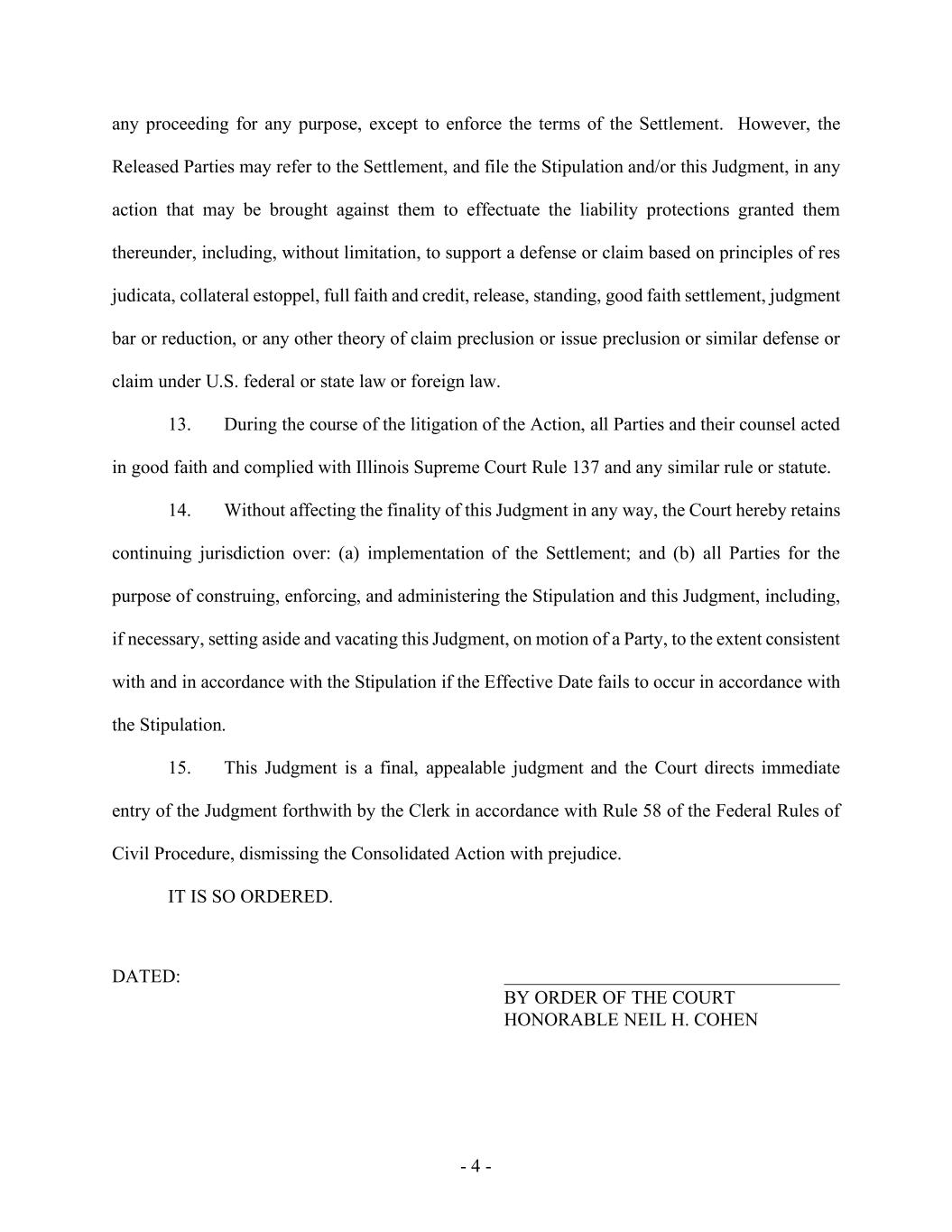 - 4 - any proceeding for any purpose, except to enforce the terms of the Settlement. However, the Released Parties may refer to the Settlement, and file the Stipulation and/or this Judgment, in any action that may be brought against them to effectuate the liability protections granted them thereunder, including, without limitation, to support a defense or claim based on principles of res judicata, collateral estoppel, full faith and credit, release, standing, good faith settlement, judgment bar or reduction, or any other theory of claim preclusion or issue preclusion or similar defense or claim under U.S. federal or state law or foreign law. 13. During the course of the litigation of the Action, all Parties and their counsel acted in good faith and complied with Illinois Supreme Court Rule 137 and any similar rule or statute. 14. Without affecting the finality of this Judgment in any way, the Court hereby retains continuing jurisdiction over: (a) implementation of the Settlement; and (b) all Parties for the purpose of construing, enforcing, and administering the Stipulation and this Judgment, including, if necessary, setting aside and vacating this Judgment, on motion of a Party, to the extent consistent with and in accordance with the Stipulation if the Effective Date fails to occur in accordance with the Stipulation. 15. This Judgment is a final, appealable judgment and the Court directs immediate entry of the Judgment forthwith by the Clerk in accordance with Rule 58 of the Federal Rules of Civil Procedure, dismissing the Consolidated Action with prejudice. IT IS SO ORDERED. DATED: BY ORDER OF THE COURT HONORABLE NEIL H. COHEN
