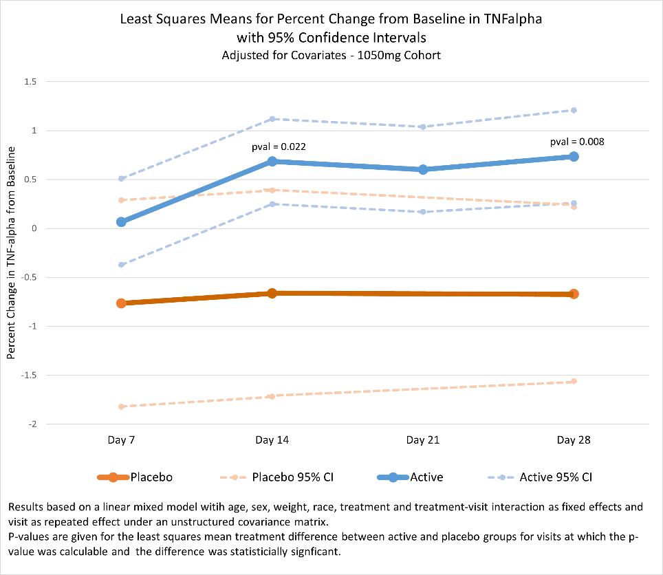 MyMD recently announced positive topline Phase 2 study results in participants with sarcopenia/frailty which showed MYMD-1 demonstrated statistical significance in reducing serum levels of TNF-α, IL-6 and sTNFR1, biomarkers common to a number of chronic inflammatory diseases, and met all primary pharmacokinetic and secondary safety and tolerability endpoints across multiple doses over 28 days of treatment. New key findings from the Phase 2 study showed that cohort 4 (1050mg) showed a reduction in TNF-α, a key cytokine, across 28 days versus placebo (p=0.002 to 0.008).