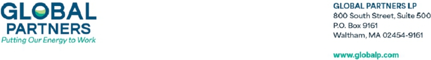 Waltham, Mass., April 25, 2024 – Global Partners LP (NYSE: GLP) (the “Partnership”) today announced that the Board of Directors of its general partner, Global GP LLC, has declared a cash distribution of $0.7100 per unit ($2.84 per unit on an annualized basis) on all of its outstanding common units from January 1, 2024 through March 31, 2024. The distribution will be paid on May 15, 2024 to unitholders of record as of the close of business on May 9, 2024.