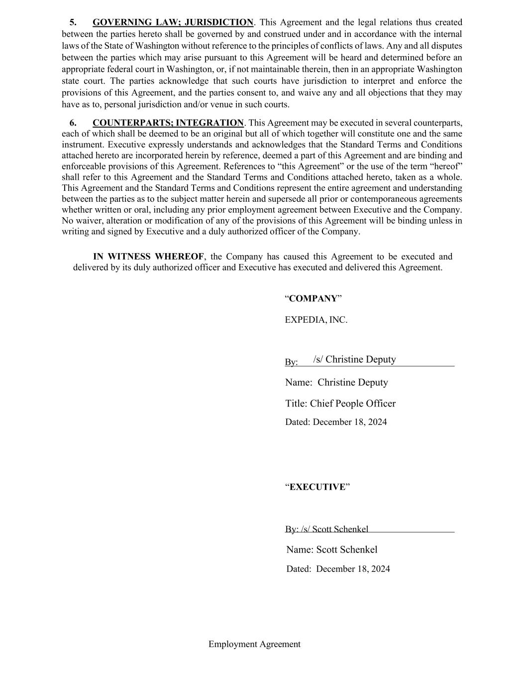 Employment Agreement 5. GOVERNING LAW; JURISDICTION. This Agreement and the legal relations thus created between the parties hereto shall be governed by and construed under and in accordance with the internal laws of the State of Washington without reference to the principles of conflicts of laws. Any and all disputes between the parties which may arise pursuant to this Agreement will be heard and determined before an appropriate federal court in Washington, or, if not maintainable therein, then in an appropriate Washington state court. The parties acknowledge that such courts have jurisdiction to interpret and enforce the provisions of this Agreement, and the parties consent to, and waive any and all objections that they may have as to, personal jurisdiction and/or venue in such courts. 6. COUNTERPARTS; INTEGRATION. This Agreement may be executed in several counterparts, each of which shall be deemed to be an original but all of which together will constitute one and the same instrument. Executive expressly understands and acknowledges that the Standard Terms and Conditions attached hereto are incorporated herein by reference, deemed a part of this Agreement and are binding and enforceable provisions of this Agreement. References to “this Agreement” or the use of the term “hereof” shall refer to this Agreement and the Standard Terms and Conditions attached hereto, taken as a whole. This Agreement and the Standard Terms and Conditions represent the entire agreement and understanding between the parties as to the subject matter herein and supersede all prior or contemporaneous agreements whether written or oral, including any prior employment agreement between Executive and the Company. No waiver, alteration or modification of any of the provisions of this Agreement will be binding unless in writing and signed by Executive and a duly authorized officer of the Company. IN WITNESS WHEREOF, the Company has caused this Agreement to be executed and delivered by its duly authorized officer and Executive has executed and delivered this Agreement. “COMPANY” EXPEDIA, INC. By: Name: Christine Deputy Title: Chief People Officer Dated: December 18, 2024 “EXECUTIVE” By: /s/ Scott Schenkel Name: Scott Schenkel Dated: December 18, 2024 /s/ Christine Deputy