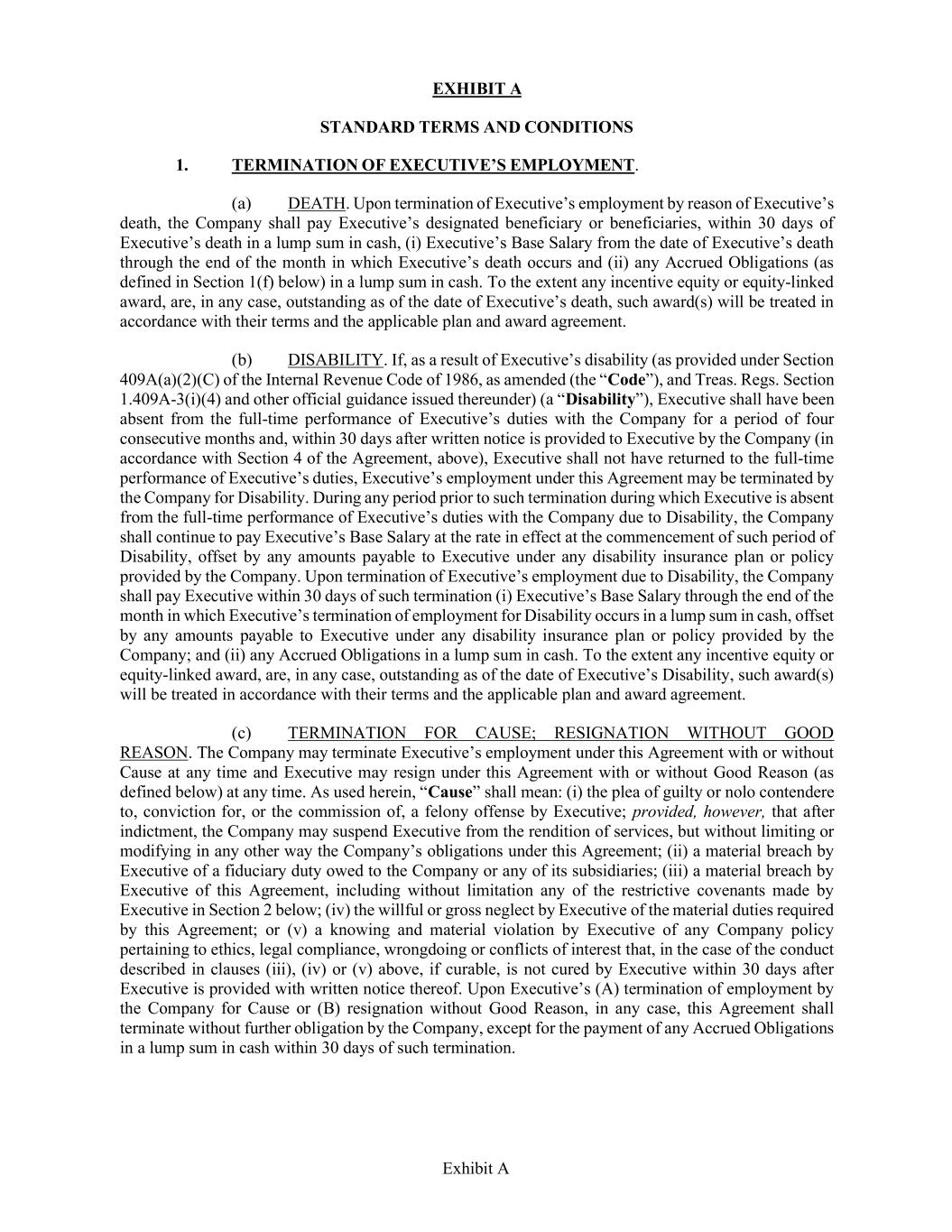 Exhibit A EXHIBIT A STANDARD TERMS AND CONDITIONS 1. TERMINATION OF EXECUTIVE’S EMPLOYMENT. (a) DEATH. Upon termination of Executive’s employment by reason of Executive’s death, the Company shall pay Executive’s designated beneficiary or beneficiaries, within 30 days of Executive’s death in a lump sum in cash, (i) Executive’s Base Salary from the date of Executive’s death through the end of the month in which Executive’s death occurs and (ii) any Accrued Obligations (as defined in Section 1(f) below) in a lump sum in cash. To the extent any incentive equity or equity-linked award, are, in any case, outstanding as of the date of Executive’s death, such award(s) will be treated in accordance with their terms and the applicable plan and award agreement. (b) DISABILITY. If, as a result of Executive’s disability (as provided under Section 409A(a)(2)(C) of the Internal Revenue Code of 1986, as amended (the “Code”), and Treas. Regs. Section 1.409A-3(i)(4) and other official guidance issued thereunder) (a “Disability”), Executive shall have been absent from the full-time performance of Executive’s duties with the Company for a period of four consecutive months and, within 30 days after written notice is provided to Executive by the Company (in accordance with Section 4 of the Agreement, above), Executive shall not have returned to the full-time performance of Executive’s duties, Executive’s employment under this Agreement may be terminated by the Company for Disability. During any period prior to such termination during which Executive is absent from the full-time performance of Executive’s duties with the Company due to Disability, the Company shall continue to pay Executive’s Base Salary at the rate in effect at the commencement of such period of Disability, offset by any amounts payable to Executive under any disability insurance plan or policy provided by the Company. Upon termination of Executive’s employment due to Disability, the Company shall pay Executive within 30 days of such termination (i) Executive’s Base Salary through the end of the month in which Executive’s termination of employment for Disability occurs in a lump sum in cash, offset by any amounts payable to Executive under any disability insurance plan or policy provided by the Company; and (ii) any Accrued Obligations in a lump sum in cash. To the extent any incentive equity or equity-linked award, are, in any case, outstanding as of the date of Executive’s Disability, such award(s) will be treated in accordance with their terms and the applicable plan and award agreement. (c) TERMINATION FOR CAUSE; RESIGNATION WITHOUT GOOD REASON. The Company may terminate Executive’s employment under this Agreement with or without Cause at any time and Executive may resign under this Agreement with or without Good Reason (as defined below) at any time. As used herein, “Cause” shall mean: (i) the plea of guilty or nolo contendere to, conviction for, or the commission of, a felony offense by Executive; provided, however, that after indictment, the Company may suspend Executive from the rendition of services, but without limiting or modifying in any other way the Company’s obligations under this Agreement; (ii) a material breach by Executive of a fiduciary duty owed to the Company or any of its subsidiaries; (iii) a material breach by Executive of this Agreement, including without limitation any of the restrictive covenants made by Executive in Section 2 below; (iv) the willful or gross neglect by Executive of the material duties required by this Agreement; or (v) a knowing and material violation by Executive of any Company policy pertaining to ethics, legal compliance, wrongdoing or conflicts of interest that, in the case of the conduct described in clauses (iii), (iv) or (v) above, if curable, is not cured by Executive within 30 days after Executive is provided with written notice thereof. Upon Executive’s (A) termination of employment by the Company for Cause or (B) resignation without Good Reason, in any case, this Agreement shall terminate without further obligation by the Company, except for the payment of any Accrued Obligations in a lump sum in cash within 30 days of such termination.