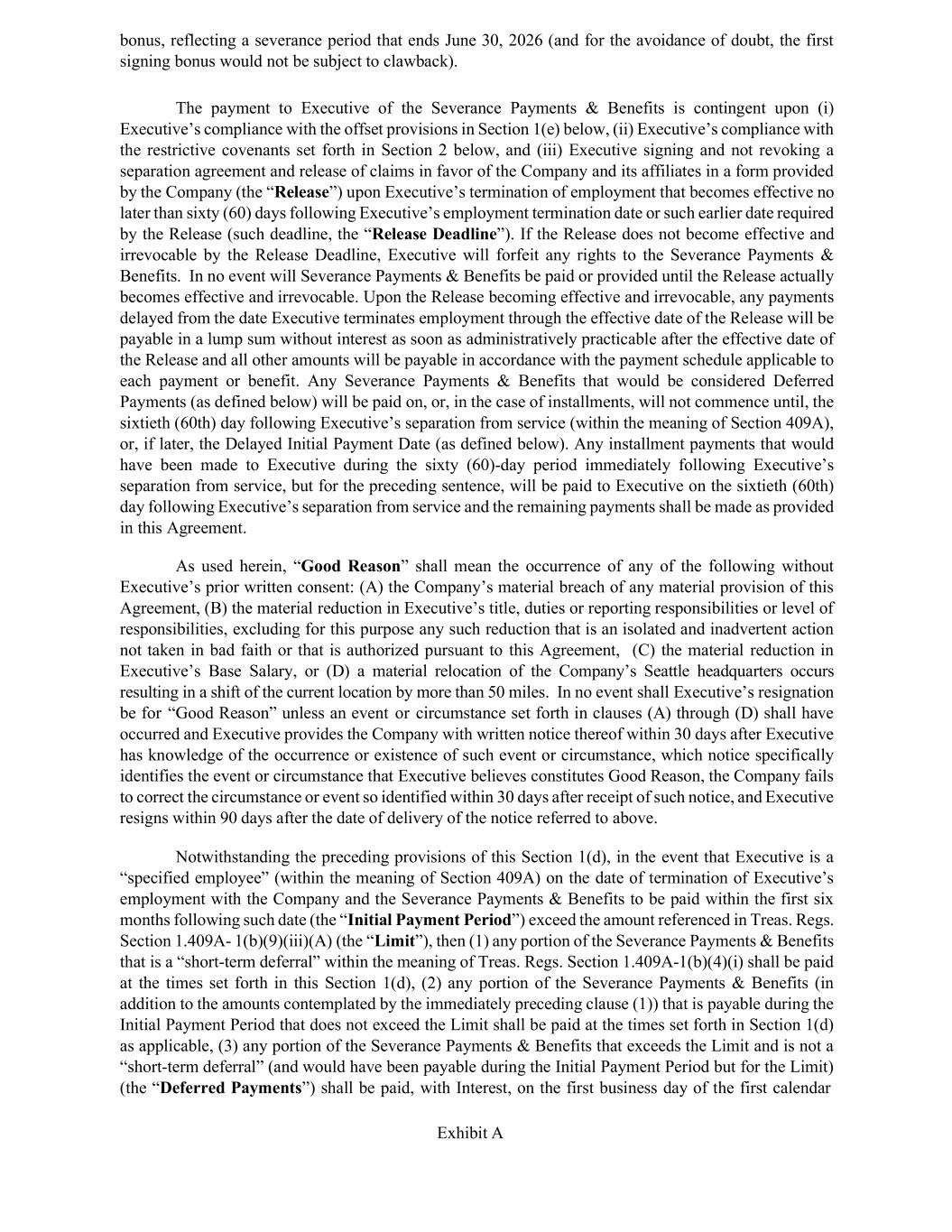 Exhibit A bonus, reflecting a severance period that ends June 30, 2026 (and for the avoidance of doubt, the first signing bonus would not be subject to clawback). The payment to Executive of the Severance Payments & Benefits is contingent upon (i) Executive’s compliance with the offset provisions in Section 1(e) below, (ii) Executive’s compliance with the restrictive covenants set forth in Section 2 below, and (iii) Executive signing and not revoking a separation agreement and release of claims in favor of the Company and its affiliates in a form provided by the Company (the “Release”) upon Executive’s termination of employment that becomes effective no later than sixty (60) days following Executive’s employment termination date or such earlier date required by the Release (such deadline, the “Release Deadline”). If the Release does not become effective and irrevocable by the Release Deadline, Executive will forfeit any rights to the Severance Payments & Benefits. In no event will Severance Payments & Benefits be paid or provided until the Release actually becomes effective and irrevocable. Upon the Release becoming effective and irrevocable, any payments delayed from the date Executive terminates employment through the effective date of the Release will be payable in a lump sum without interest as soon as administratively practicable after the effective date of the Release and all other amounts will be payable in accordance with the payment schedule applicable to each payment or benefit. Any Severance Payments & Benefits that would be considered Deferred Payments (as defined below) will be paid on, or, in the case of installments, will not commence until, the sixtieth (60th) day following Executive’s separation from service (within the meaning of Section 409A), or, if later, the Delayed Initial Payment Date (as defined below). Any installment payments that would have been made to Executive during the sixty (60)-day period immediately following Executive’s separation from service, but for the preceding sentence, will be paid to Executive on the sixtieth (60th) day following Executive’s separation from service and the remaining payments shall be made as provided in this Agreement. As used herein, “Good Reason” shall mean the occurrence of any of the following without Executive’s prior written consent: (A) the Company’s material breach of any material provision of this Agreement, (B) the material reduction in Executive’s title, duties or reporting responsibilities or level of responsibilities, excluding for this purpose any such reduction that is an isolated and inadvertent action not taken in bad faith or that is authorized pursuant to this Agreement, (C) the material reduction in Executive’s Base Salary, or (D) a material relocation of the Company’s Seattle headquarters occurs resulting in a shift of the current location by more than 50 miles. In no event shall Executive’s resignation be for “Good Reason” unless an event or circumstance set forth in clauses (A) through (D) shall have occurred and Executive provides the Company with written notice thereof within 30 days after Executive has knowledge of the occurrence or existence of such event or circumstance, which notice specifically identifies the event or circumstance that Executive believes constitutes Good Reason, the Company fails to correct the circumstance or event so identified within 30 days after receipt of such notice, and Executive resigns within 90 days after the date of delivery of the notice referred to above. Notwithstanding the preceding provisions of this Section 1(d), in the event that Executive is a “specified employee” (within the meaning of Section 409A) on the date of termination of Executive’s employment with the Company and the Severance Payments & Benefits to be paid within the first six months following such date (the “Initial Payment Period”) exceed the amount referenced in Treas. Regs. Section 1.409A- 1(b)(9)(iii)(A) (the “Limit”), then (1) any portion of the Severance Payments & Benefits that is a “short-term deferral” within the meaning of Treas. Regs. Section 1.409A-1(b)(4)(i) shall be paid at the times set forth in this Section 1(d), (2) any portion of the Severance Payments & Benefits (in addition to the amounts contemplated by the immediately preceding clause (1)) that is payable during the Initial Payment Period that does not exceed the Limit shall be paid at the times set forth in Section 1(d) as applicable, (3) any portion of the Severance Payments & Benefits that exceeds the Limit and is not a “short-term deferral” (and would have been payable during the Initial Payment Period but for the Limit) (the “Deferred Payments”) shall be paid, with Interest, on the first business day of the first calendar