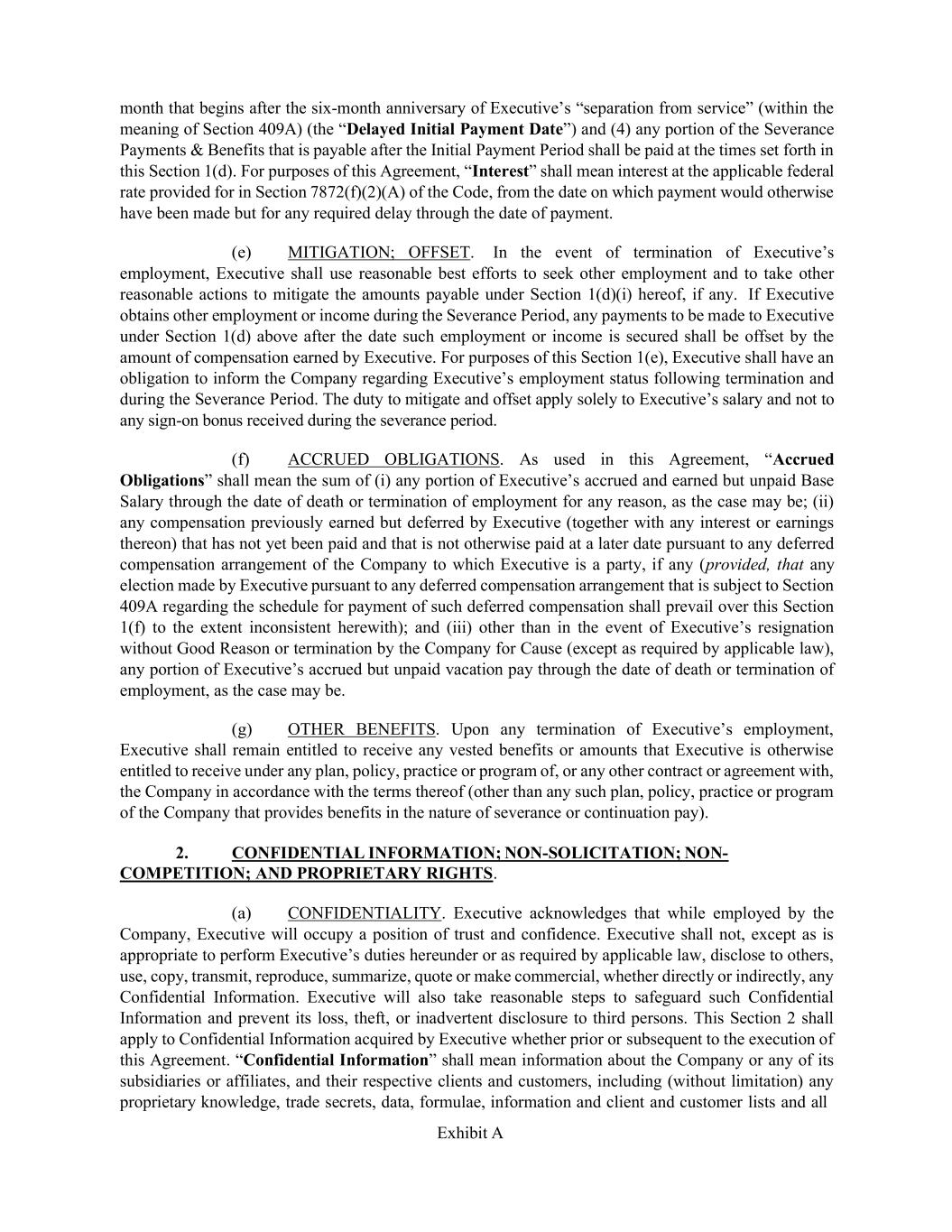Exhibit A month that begins after the six-month anniversary of Executive’s “separation from service” (within the meaning of Section 409A) (the “Delayed Initial Payment Date”) and (4) any portion of the Severance Payments & Benefits that is payable after the Initial Payment Period shall be paid at the times set forth in this Section 1(d). For purposes of this Agreement, “Interest” shall mean interest at the applicable federal rate provided for in Section 7872(f)(2)(A) of the Code, from the date on which payment would otherwise have been made but for any required delay through the date of payment. (e) MITIGATION; OFFSET. In the event of termination of Executive’s employment, Executive shall use reasonable best efforts to seek other employment and to take other reasonable actions to mitigate the amounts payable under Section 1(d)(i) hereof, if any. If Executive obtains other employment or income during the Severance Period, any payments to be made to Executive under Section 1(d) above after the date such employment or income is secured shall be offset by the amount of compensation earned by Executive. For purposes of this Section 1(e), Executive shall have an obligation to inform the Company regarding Executive’s employment status following termination and during the Severance Period. The duty to mitigate and offset apply solely to Executive’s salary and not to any sign-on bonus received during the severance period. (f) ACCRUED OBLIGATIONS. As used in this Agreement, “Accrued Obligations” shall mean the sum of (i) any portion of Executive’s accrued and earned but unpaid Base Salary through the date of death or termination of employment for any reason, as the case may be; (ii) any compensation previously earned but deferred by Executive (together with any interest or earnings thereon) that has not yet been paid and that is not otherwise paid at a later date pursuant to any deferred compensation arrangement of the Company to which Executive is a party, if any (provided, that any election made by Executive pursuant to any deferred compensation arrangement that is subject to Section 409A regarding the schedule for payment of such deferred compensation shall prevail over this Section 1(f) to the extent inconsistent herewith); and (iii) other than in the event of Executive’s resignation without Good Reason or termination by the Company for Cause (except as required by applicable law), any portion of Executive’s accrued but unpaid vacation pay through the date of death or termination of employment, as the case may be. (g) OTHER BENEFITS. Upon any termination of Executive’s employment, Executive shall remain entitled to receive any vested benefits or amounts that Executive is otherwise entitled to receive under any plan, policy, practice or program of, or any other contract or agreement with, the Company in accordance with the terms thereof (other than any such plan, policy, practice or program of the Company that provides benefits in the nature of severance or continuation pay). 2. CONFIDENTIAL INFORMATION; NON-SOLICITATION; NON- COMPETITION; AND PROPRIETARY RIGHTS. (a) CONFIDENTIALITY. Executive acknowledges that while employed by the Company, Executive will occupy a position of trust and confidence. Executive shall not, except as is appropriate to perform Executive’s duties hereunder or as required by applicable law, disclose to others, use, copy, transmit, reproduce, summarize, quote or make commercial, whether directly or indirectly, any Confidential Information. Executive will also take reasonable steps to safeguard such Confidential Information and prevent its loss, theft, or inadvertent disclosure to third persons. This Section 2 shall apply to Confidential Information acquired by Executive whether prior or subsequent to the execution of this Agreement. “Confidential Information” shall mean information about the Company or any of its subsidiaries or affiliates, and their respective clients and customers, including (without limitation) any proprietary knowledge, trade secrets, data, formulae, information and client and customer lists and all