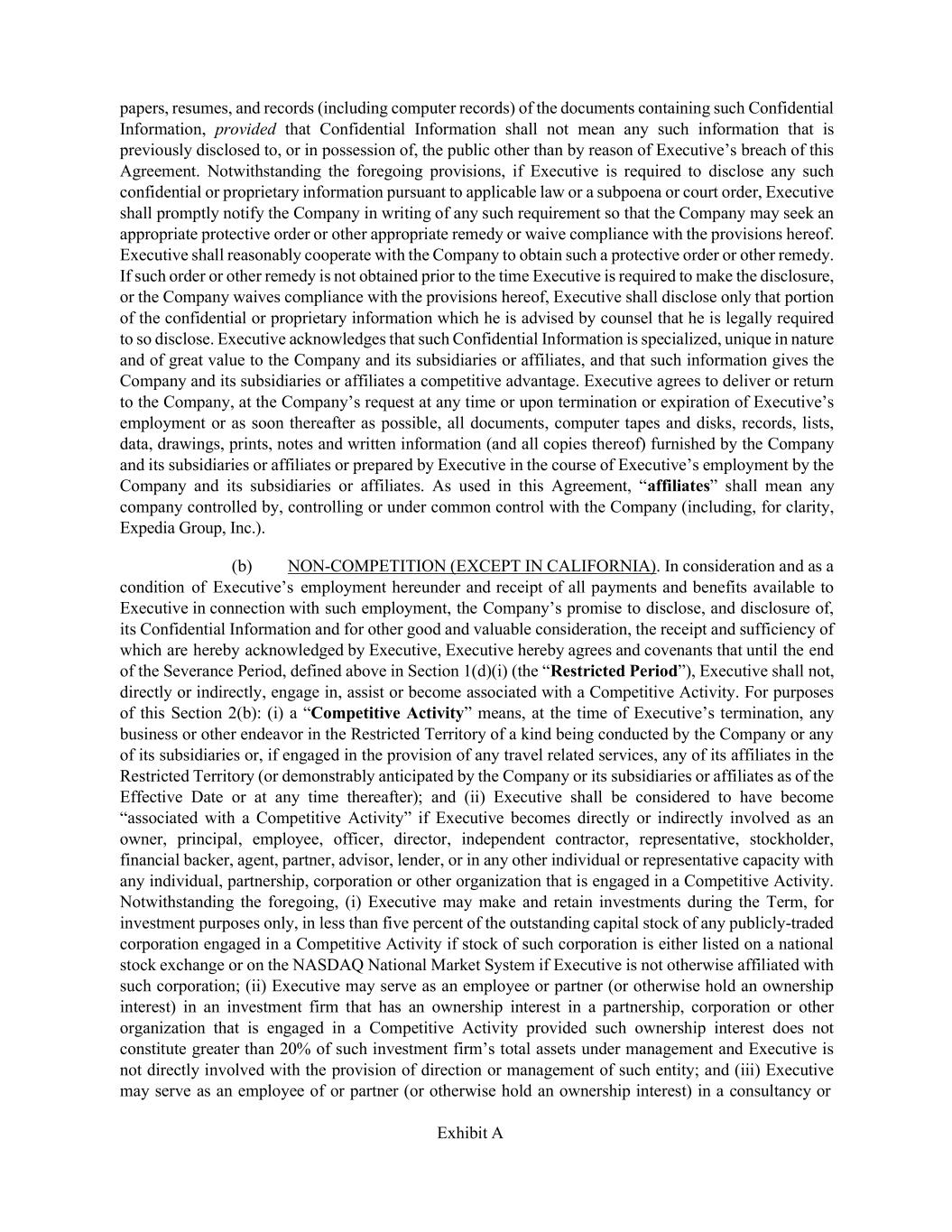 Exhibit A papers, resumes, and records (including computer records) of the documents containing such Confidential Information, provided that Confidential Information shall not mean any such information that is previously disclosed to, or in possession of, the public other than by reason of Executive’s breach of this Agreement. Notwithstanding the foregoing provisions, if Executive is required to disclose any such confidential or proprietary information pursuant to applicable law or a subpoena or court order, Executive shall promptly notify the Company in writing of any such requirement so that the Company may seek an appropriate protective order or other appropriate remedy or waive compliance with the provisions hereof. Executive shall reasonably cooperate with the Company to obtain such a protective order or other remedy. If such order or other remedy is not obtained prior to the time Executive is required to make the disclosure, or the Company waives compliance with the provisions hereof, Executive shall disclose only that portion of the confidential or proprietary information which he is advised by counsel that he is legally required to so disclose. Executive acknowledges that such Confidential Information is specialized, unique in nature and of great value to the Company and its subsidiaries or affiliates, and that such information gives the Company and its subsidiaries or affiliates a competitive advantage. Executive agrees to deliver or return to the Company, at the Company’s request at any time or upon termination or expiration of Executive’s employment or as soon thereafter as possible, all documents, computer tapes and disks, records, lists, data, drawings, prints, notes and written information (and all copies thereof) furnished by the Company and its subsidiaries or affiliates or prepared by Executive in the course of Executive’s employment by the Company and its subsidiaries or affiliates. As used in this Agreement, “affiliates” shall mean any company controlled by, controlling or under common control with the Company (including, for clarity, Expedia Group, Inc.). (b) NON-COMPETITION (EXCEPT IN CALIFORNIA). In consideration and as a condition of Executive’s employment hereunder and receipt of all payments and benefits available to Executive in connection with such employment, the Company’s promise to disclose, and disclosure of, its Confidential Information and for other good and valuable consideration, the receipt and sufficiency of which are hereby acknowledged by Executive, Executive hereby agrees and covenants that until the end of the Severance Period, defined above in Section 1(d)(i) (the “Restricted Period”), Executive shall not, directly or indirectly, engage in, assist or become associated with a Competitive Activity. For purposes of this Section 2(b): (i) a “Competitive Activity” means, at the time of Executive’s termination, any business or other endeavor in the Restricted Territory of a kind being conducted by the Company or any of its subsidiaries or, if engaged in the provision of any travel related services, any of its affiliates in the Restricted Territory (or demonstrably anticipated by the Company or its subsidiaries or affiliates as of the Effective Date or at any time thereafter); and (ii) Executive shall be considered to have become “associated with a Competitive Activity” if Executive becomes directly or indirectly involved as an owner, principal, employee, officer, director, independent contractor, representative, stockholder, financial backer, agent, partner, advisor, lender, or in any other individual or representative capacity with any individual, partnership, corporation or other organization that is engaged in a Competitive Activity. Notwithstanding the foregoing, (i) Executive may make and retain investments during the Term, for investment purposes only, in less than five percent of the outstanding capital stock of any publicly-traded corporation engaged in a Competitive Activity if stock of such corporation is either listed on a national stock exchange or on the NASDAQ National Market System if Executive is not otherwise affiliated with such corporation; (ii) Executive may serve as an employee or partner (or otherwise hold an ownership interest) in an investment firm that has an ownership interest in a partnership, corporation or other organization that is engaged in a Competitive Activity provided such ownership interest does not constitute greater than 20% of such investment firm’s total assets under management and Executive is not directly involved with the provision of direction or management of such entity; and (iii) Executive may serve as an employee of or partner (or otherwise hold an ownership interest) in a consultancy or