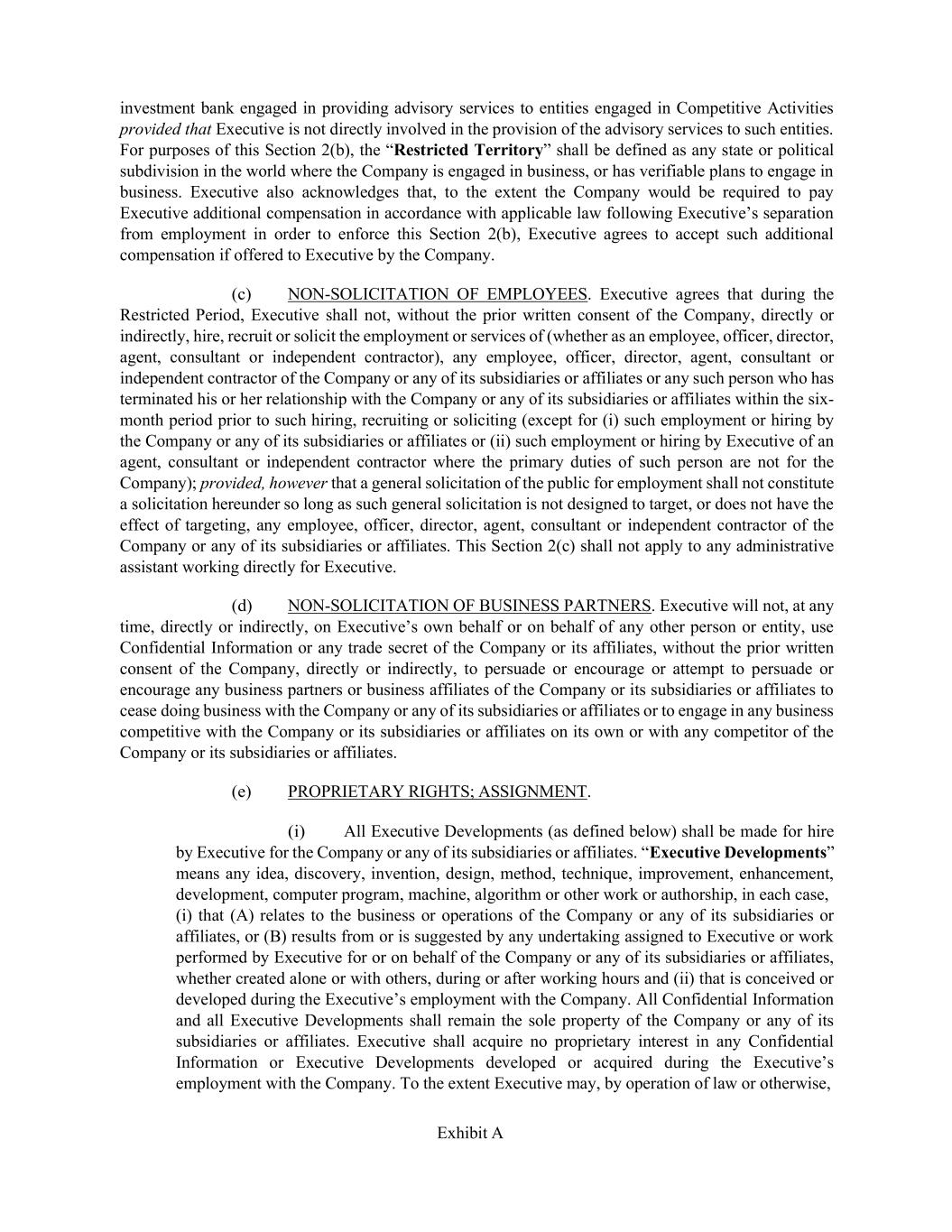 Exhibit A investment bank engaged in providing advisory services to entities engaged in Competitive Activities provided that Executive is not directly involved in the provision of the advisory services to such entities. For purposes of this Section 2(b), the “Restricted Territory” shall be defined as any state or political subdivision in the world where the Company is engaged in business, or has verifiable plans to engage in business. Executive also acknowledges that, to the extent the Company would be required to pay Executive additional compensation in accordance with applicable law following Executive’s separation from employment in order to enforce this Section 2(b), Executive agrees to accept such additional compensation if offered to Executive by the Company. (c) NON-SOLICITATION OF EMPLOYEES. Executive agrees that during the Restricted Period, Executive shall not, without the prior written consent of the Company, directly or indirectly, hire, recruit or solicit the employment or services of (whether as an employee, officer, director, agent, consultant or independent contractor), any employee, officer, director, agent, consultant or independent contractor of the Company or any of its subsidiaries or affiliates or any such person who has terminated his or her relationship with the Company or any of its subsidiaries or affiliates within the six- month period prior to such hiring, recruiting or soliciting (except for (i) such employment or hiring by the Company or any of its subsidiaries or affiliates or (ii) such employment or hiring by Executive of an agent, consultant or independent contractor where the primary duties of such person are not for the Company); provided, however that a general solicitation of the public for employment shall not constitute a solicitation hereunder so long as such general solicitation is not designed to target, or does not have the effect of targeting, any employee, officer, director, agent, consultant or independent contractor of the Company or any of its subsidiaries or affiliates. This Section 2(c) shall not apply to any administrative assistant working directly for Executive. (d) NON-SOLICITATION OF BUSINESS PARTNERS. Executive will not, at any time, directly or indirectly, on Executive’s own behalf or on behalf of any other person or entity, use Confidential Information or any trade secret of the Company or its affiliates, without the prior written consent of the Company, directly or indirectly, to persuade or encourage or attempt to persuade or encourage any business partners or business affiliates of the Company or its subsidiaries or affiliates to cease doing business with the Company or any of its subsidiaries or affiliates or to engage in any business competitive with the Company or its subsidiaries or affiliates on its own or with any competitor of the Company or its subsidiaries or affiliates. (e) PROPRIETARY RIGHTS; ASSIGNMENT. (i) All Executive Developments (as defined below) shall be made for hire by Executive for the Company or any of its subsidiaries or affiliates. “Executive Developments” means any idea, discovery, invention, design, method, technique, improvement, enhancement, development, computer program, machine, algorithm or other work or authorship, in each case, (i) that (A) relates to the business or operations of the Company or any of its subsidiaries or affiliates, or (B) results from or is suggested by any undertaking assigned to Executive or work performed by Executive for or on behalf of the Company or any of its subsidiaries or affiliates, whether created alone or with others, during or after working hours and (ii) that is conceived or developed during the Executive’s employment with the Company. All Confidential Information and all Executive Developments shall remain the sole property of the Company or any of its subsidiaries or affiliates. Executive shall acquire no proprietary interest in any Confidential Information or Executive Developments developed or acquired during the Executive’s employment with the Company. To the extent Executive may, by operation of law or otherwise,