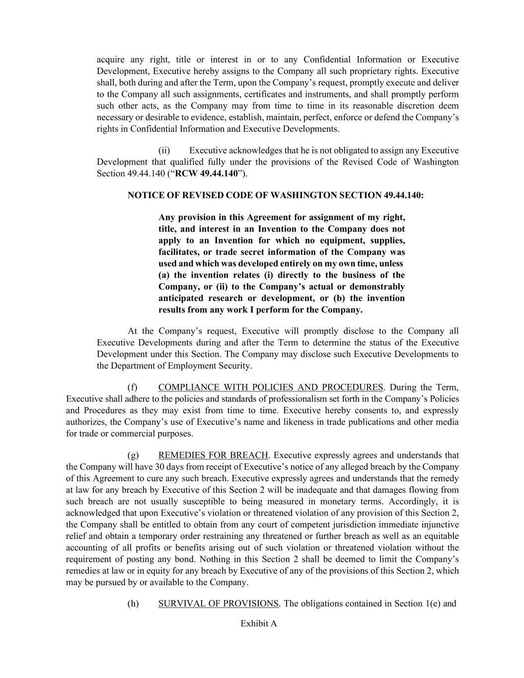 Exhibit A acquire any right, title or interest in or to any Confidential Information or Executive Development, Executive hereby assigns to the Company all such proprietary rights. Executive shall, both during and after the Term, upon the Company’s request, promptly execute and deliver to the Company all such assignments, certificates and instruments, and shall promptly perform such other acts, as the Company may from time to time in its reasonable discretion deem necessary or desirable to evidence, establish, maintain, perfect, enforce or defend the Company’s rights in Confidential Information and Executive Developments. (ii) Executive acknowledges that he is not obligated to assign any Executive Development that qualified fully under the provisions of the Revised Code of Washington Section 49.44.140 (“RCW 49.44.140”). NOTICE OF REVISED CODE OF WASHINGTON SECTION 49.44.140: Any provision in this Agreement for assignment of my right, title, and interest in an Invention to the Company does not apply to an Invention for which no equipment, supplies, facilitates, or trade secret information of the Company was used and which was developed entirely on my own time, unless (a) the invention relates (i) directly to the business of the Company, or (ii) to the Company’s actual or demonstrably anticipated research or development, or (b) the invention results from any work I perform for the Company. At the Company’s request, Executive will promptly disclose to the Company all Executive Developments during and after the Term to determine the status of the Executive Development under this Section. The Company may disclose such Executive Developments to the Department of Employment Security. (f) COMPLIANCE WITH POLICIES AND PROCEDURES. During the Term, Executive shall adhere to the policies and standards of professionalism set forth in the Company’s Policies and Procedures as they may exist from time to time. Executive hereby consents to, and expressly authorizes, the Company’s use of Executive’s name and likeness in trade publications and other media for trade or commercial purposes. (g) REMEDIES FOR BREACH. Executive expressly agrees and understands that the Company will have 30 days from receipt of Executive’s notice of any alleged breach by the Company of this Agreement to cure any such breach. Executive expressly agrees and understands that the remedy at law for any breach by Executive of this Section 2 will be inadequate and that damages flowing from such breach are not usually susceptible to being measured in monetary terms. Accordingly, it is acknowledged that upon Executive’s violation or threatened violation of any provision of this Section 2, the Company shall be entitled to obtain from any court of competent jurisdiction immediate injunctive relief and obtain a temporary order restraining any threatened or further breach as well as an equitable accounting of all profits or benefits arising out of such violation or threatened violation without the requirement of posting any bond. Nothing in this Section 2 shall be deemed to limit the Company’s remedies at law or in equity for any breach by Executive of any of the provisions of this Section 2, which may be pursued by or available to the Company. (h) SURVIVAL OF PROVISIONS. The obligations contained in Section 1(e) and