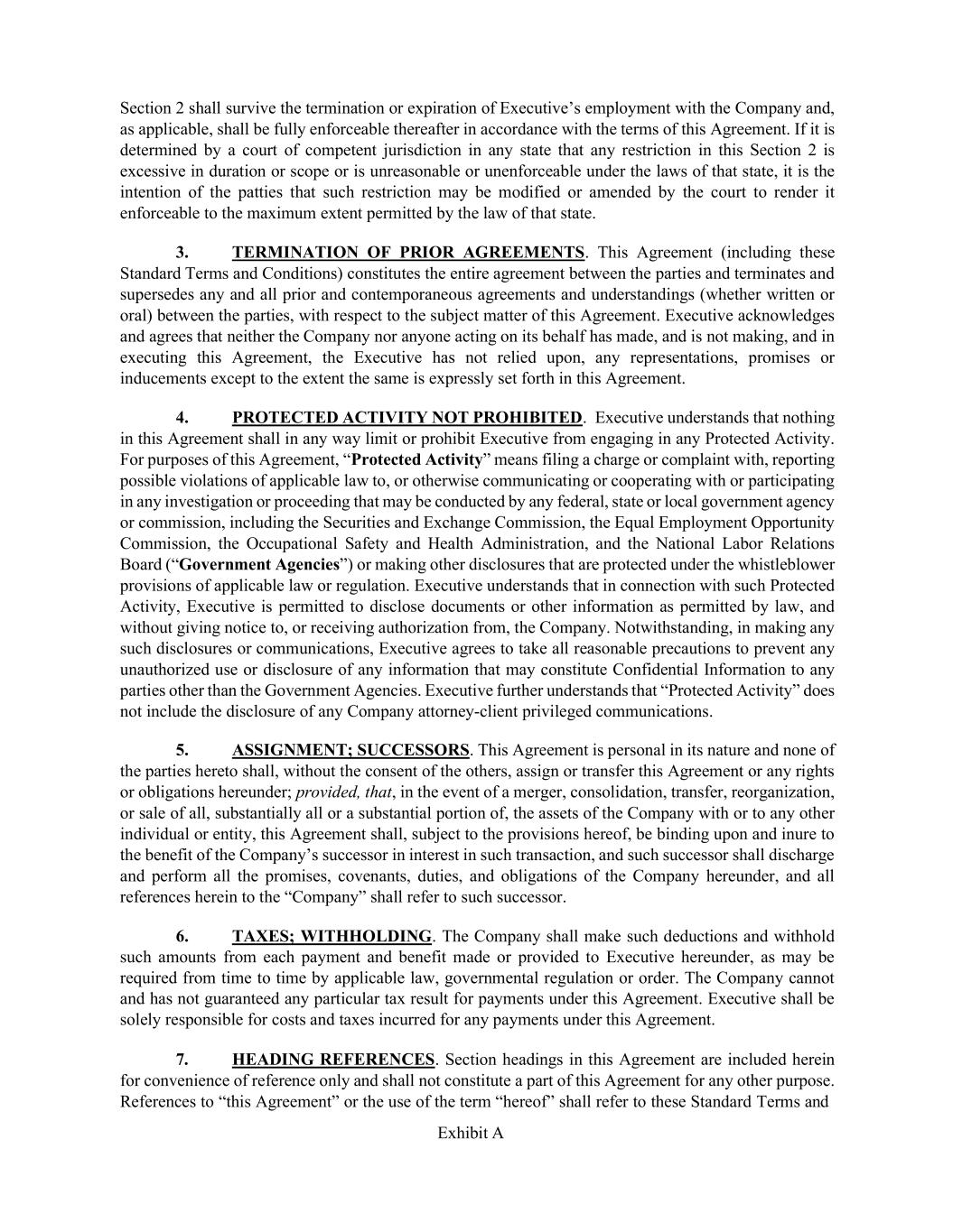 Exhibit A Section 2 shall survive the termination or expiration of Executive’s employment with the Company and, as applicable, shall be fully enforceable thereafter in accordance with the terms of this Agreement. If it is determined by a court of competent jurisdiction in any state that any restriction in this Section 2 is excessive in duration or scope or is unreasonable or unenforceable under the laws of that state, it is the intention of the patties that such restriction may be modified or amended by the court to render it enforceable to the maximum extent permitted by the law of that state. 3. TERMINATION OF PRIOR AGREEMENTS. This Agreement (including these Standard Terms and Conditions) constitutes the entire agreement between the parties and terminates and supersedes any and all prior and contemporaneous agreements and understandings (whether written or oral) between the parties, with respect to the subject matter of this Agreement. Executive acknowledges and agrees that neither the Company nor anyone acting on its behalf has made, and is not making, and in executing this Agreement, the Executive has not relied upon, any representations, promises or inducements except to the extent the same is expressly set forth in this Agreement. 4. PROTECTED ACTIVITY NOT PROHIBITED. Executive understands that nothing in this Agreement shall in any way limit or prohibit Executive from engaging in any Protected Activity. For purposes of this Agreement, “Protected Activity” means filing a charge or complaint with, reporting possible violations of applicable law to, or otherwise communicating or cooperating with or participating in any investigation or proceeding that may be conducted by any federal, state or local government agency or commission, including the Securities and Exchange Commission, the Equal Employment Opportunity Commission, the Occupational Safety and Health Administration, and the National Labor Relations Board (“Government Agencies”) or making other disclosures that are protected under the whistleblower provisions of applicable law or regulation. Executive understands that in connection with such Protected Activity, Executive is permitted to disclose documents or other information as permitted by law, and without giving notice to, or receiving authorization from, the Company. Notwithstanding, in making any such disclosures or communications, Executive agrees to take all reasonable precautions to prevent any unauthorized use or disclosure of any information that may constitute Confidential Information to any parties other than the Government Agencies. Executive further understands that “Protected Activity” does not include the disclosure of any Company attorney-client privileged communications. 5. ASSIGNMENT; SUCCESSORS. This Agreement is personal in its nature and none of the parties hereto shall, without the consent of the others, assign or transfer this Agreement or any rights or obligations hereunder; provided, that, in the event of a merger, consolidation, transfer, reorganization, or sale of all, substantially all or a substantial portion of, the assets of the Company with or to any other individual or entity, this Agreement shall, subject to the provisions hereof, be binding upon and inure to the benefit of the Company’s successor in interest in such transaction, and such successor shall discharge and perform all the promises, covenants, duties, and obligations of the Company hereunder, and all references herein to the “Company” shall refer to such successor. 6. TAXES; WITHHOLDING. The Company shall make such deductions and withhold such amounts from each payment and benefit made or provided to Executive hereunder, as may be required from time to time by applicable law, governmental regulation or order. The Company cannot and has not guaranteed any particular tax result for payments under this Agreement. Executive shall be solely responsible for costs and taxes incurred for any payments under this Agreement. 7. HEADING REFERENCES. Section headings in this Agreement are included herein for convenience of reference only and shall not constitute a part of this Agreement for any other purpose. References to “this Agreement” or the use of the term “hereof” shall refer to these Standard Terms and