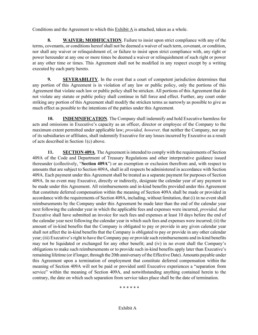 Exhibit A Conditions and the Agreement to which this Exhibit A is attached, taken as a whole. 8. WAIVER; MODIFICATION. Failure to insist upon strict compliance with any of the terms, covenants, or conditions hereof shall not be deemed a waiver of such term, covenant, or condition, nor shall any waiver or relinquishment of, or failure to insist upon strict compliance with, any right or power hereunder at any one or more times be deemed a waiver or relinquishment of such right or power at any other time or times. This Agreement shall not be modified in any respect except by a writing executed by each party hereto. 9. SEVERABILITY. In the event that a court of competent jurisdiction determines that any portion of this Agreement is in violation of any law or public policy, only the portions of this Agreement that violate such law or public policy shall be stricken. All portions of this Agreement that do not violate any statute or public policy shall continue in full force and effect. Further, any court order striking any portion of this Agreement shall modify the stricken terms as narrowly as possible to give as much effect as possible to the intentions of the patties under this Agreement. 10. INDEMNIFICATION. The Company shall indemnify and hold Executive harmless for acts and omissions in Executive’s capacity as an officer, director or employee of the Company to the maximum extent permitted under applicable law; provided, however, that neither the Company, nor any of its subsidiaries or affiliates, shall indemnify Executive for any losses incurred by Executive as a result of acts described in Section 1(c) above. 11. SECTION 409A. The Agreement is intended to comply with the requirements of Section 409A of the Code and Department of Treasury Regulations and other interpretative guidance issued thereunder (collectively, “Section 409A”) or an exemption or exclusion therefrom and, with respect to amounts that are subject to Section 409A, shall in all respects be administered in accordance with Section 409A. Each payment under this Agreement shall be treated as a separate payment for purposes of Section 409A. In no event may Executive, directly or indirectly, designate the calendar year of any payment to be made under this Agreement. All reimbursements and in-kind benefits provided under this Agreement that constitute deferred compensation within the meaning of Section 409A shall be made or provided in accordance with the requirements of Section 409A, including, without limitation, that (i) in no event shall reimbursements by the Company under this Agreement be made later than the end of the calendar year next following the calendar year in which the applicable fees and expenses were incurred, provided, that Executive shall have submitted an invoice for such fees and expenses at least 10 days before the end of the calendar year next following the calendar year in which such fees and expenses were incurred; (ii) the amount of in-kind benefits that the Company is obligated to pay or provide in any given calendar year shall not affect the in-kind benefits that the Company is obligated to pay or provide in any other calendar year; (iii) Executive’s right to have the Company pay or provide such reimbursements and in-kind benefits may not be liquidated or exchanged for any other benefit; and (iv) in no event shall the Company’s obligations to make such reimbursements or to provide such in-kind benefits apply later than Executive’s remaining lifetime (or if longer, through the 20th anniversary of the Effective Date). Amounts payable under this Agreement upon a termination of employment that constitute deferred compensation within the meaning of Section 409A will not be paid or provided until Executive experiences a “separation from service” within the meaning of Section 409A, and notwithstanding anything contained herein to the contrary, the date on which such separation from service takes place shall be the date of termination. * * * * * *
