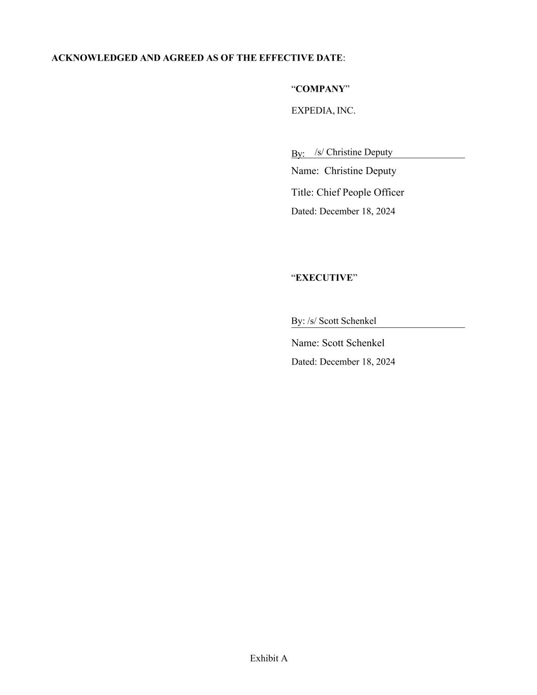 Exhibit A ACKNOWLEDGED AND AGREED AS OF THE EFFECTIVE DATE: “COMPANY” EXPEDIA, INC. By: Name: Christine Deputy Title: Chief People Officer Dated: December 18, 2024 “EXECUTIVE” By: /s/ Scott Schenkel Name: Scott Schenkel Dated: December 18, 2024 /s/ Christine Deputy