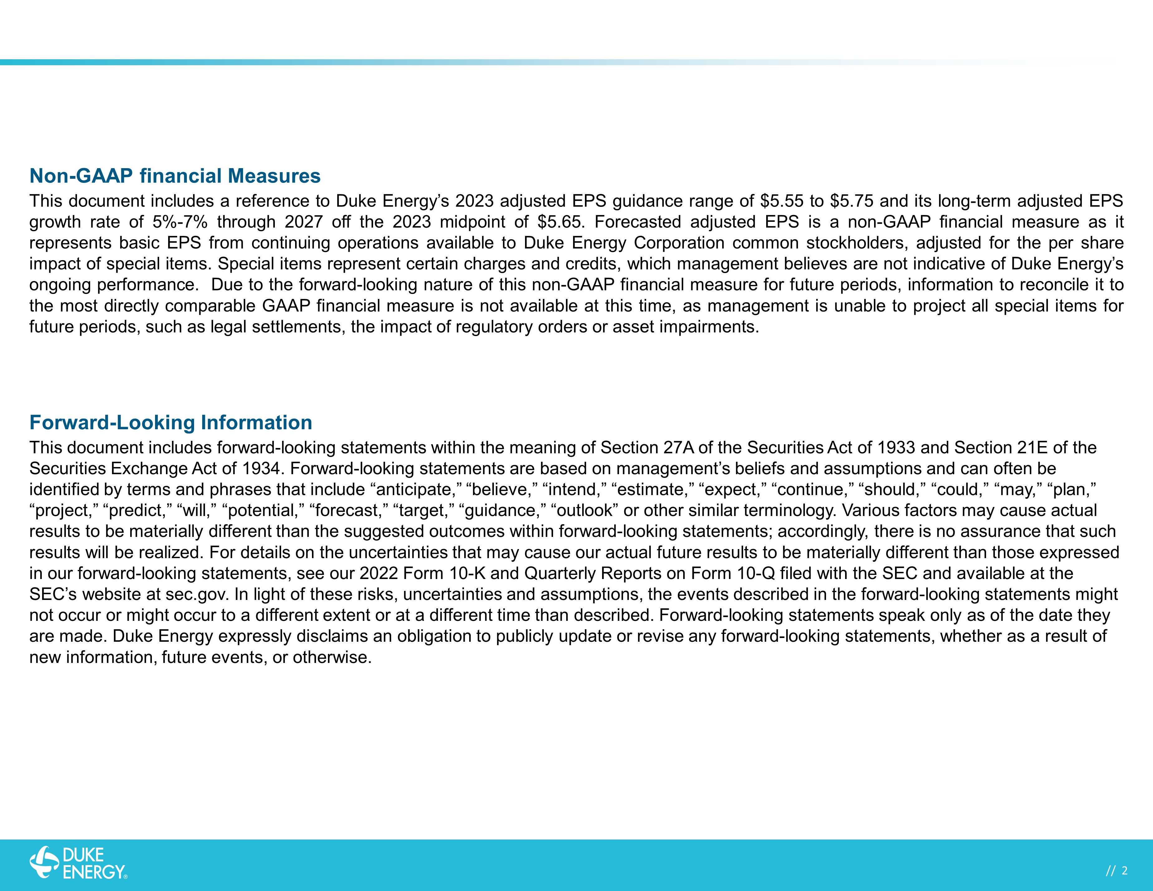 // 2 // 2 Non - GAAP financial Measures This document includes a reference to Duke Energy’s 2023 adjusted EPS guidance range of $ 5 . 55 to $ 5 . 75 and its long - term adjusted EPS growth rate of 5 % - 7 % through 2027 off the 2023 midpoint of $ 5 . 65 . Forecasted adjusted EPS is a non - GAAP financial measure as it represents basic EPS from continuing operations available to Duke Energy Corporation common stockholders, adjusted for the per share impact of special items . Special items represent certain charges and credits, which management believes are not indicative of Duke Energy’s ongoing performance . Due to the forward - looking nature of this non - GAAP financial measure for future periods, information to reconcile it to the most directly comparable GAAP financial measure is not available at this time, as management is unable to project all special items for future periods, such as legal settlements, the impact of regulatory orders or asset impairments . Forward - Looking Information This document includes forward - looking statements within the meaning of Section 27A of the Securities Act of 1933 and Section 21 E of the Securities Exchange Act of 1934. Forward - looking statements are based on management’s beliefs and assumptions and can often be identified by terms and phrases that include “anticipate,” “believe,” “intend,” “estimate,” “expect,” “continue,” “should,” “ cou ld,” “may,” “plan,” “project,” “predict,” “will,” “potential,” “forecast,” “target,” “guidance,” “outlook” or other similar terminology. Various fac tors may cause actual results to be materially different than the suggested outcomes within forward - looking statements; accordingly, there is no assur ance that such results will be realized. For details on the uncertainties that may cause our actual future results to be materially different than those expressed in our forward - looking statements, see our 2022 Form 10 - K and Quarterly Reports on Form 10 - Q filed with the SEC and available at the SEC’s website at sec.gov. In light of these risks, uncertainties and assumptions, the events described in the forward - looking st atements might not occur or might occur to a different extent or at a different time than described. Forward - looking statements speak only as o f the date they are made. Duke Energy expressly disclaims an obligation to publicly update or revise any forward - looking statements, whether as a result of new information, future events, or otherwise.