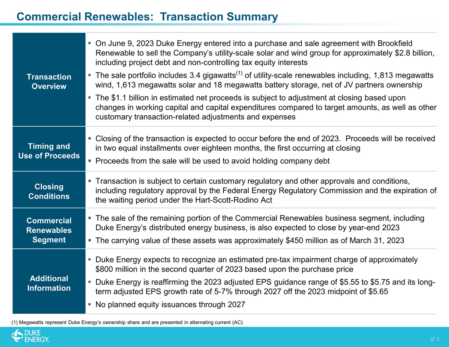 // 1 // 1 Commercial Renewables: Transaction Summary Transaction Overview ▪ On June 10, 2023 Duke Energy entered into a purchase and sale agreement with Brookfield Renewable to sell the Company’s utility - scale solar and wind group for approximately $2.8 billion, including project debt and non - controlling tax equity interests ▪ The sale portfolio includes 3.4 gigawatts (1) of utility - scale renewables including, 1,813 megawatts wind, 1,613 megawatts solar and 18 megawatts battery storage, net of JV partners ownership ▪ The $1.1 billion in estimated net proceeds is subject to adjustment at closing based upon changes in working capital and capital expenditures compared to target amounts, as well as other customary transaction - related adjustments and expenses Timing and Use of Proceeds ▪ Closing of the transaction is expected to occur before the end of 2023. Proceeds will be received in two equal installments over eighteen months, the first occurring at closing ▪ Proceeds from the sale will be used to avoid holding company debt Closing Conditions ▪ Transaction is subject to certain customary regulatory and other approvals and conditions, including regulatory approval by the Federal Energy Regulatory Commission and the expiration of the waiting period under the Hart - Scott - Rodino Act Commercial Renewables Segment ▪ The sale of the remaining portion of the Commercial Renewables business segment, including Duke Energy’s distributed energy business, is also expected to close by year - end 2023 ▪ The carrying value of these assets was approximately $450 million as of March 31, 2023 Additional Information ▪ Duke Energy expects to recognize an estimated pre - tax impairment charge of approximately $800 million in the second quarter of 2023 based upon the purchase price ▪ Duke Energy is reaffirming the 2023 adjusted EPS guidance range of $5.55 to $5.75 and its long - term adjusted EPS growth rate of 5 - 7% through 2027 off the 2023 midpoint of $5.65 ▪ No planned equity issuances through 2027 (1) Megawatts represent Duke Energy’s ownership share and are presented in alternating current (AC)
