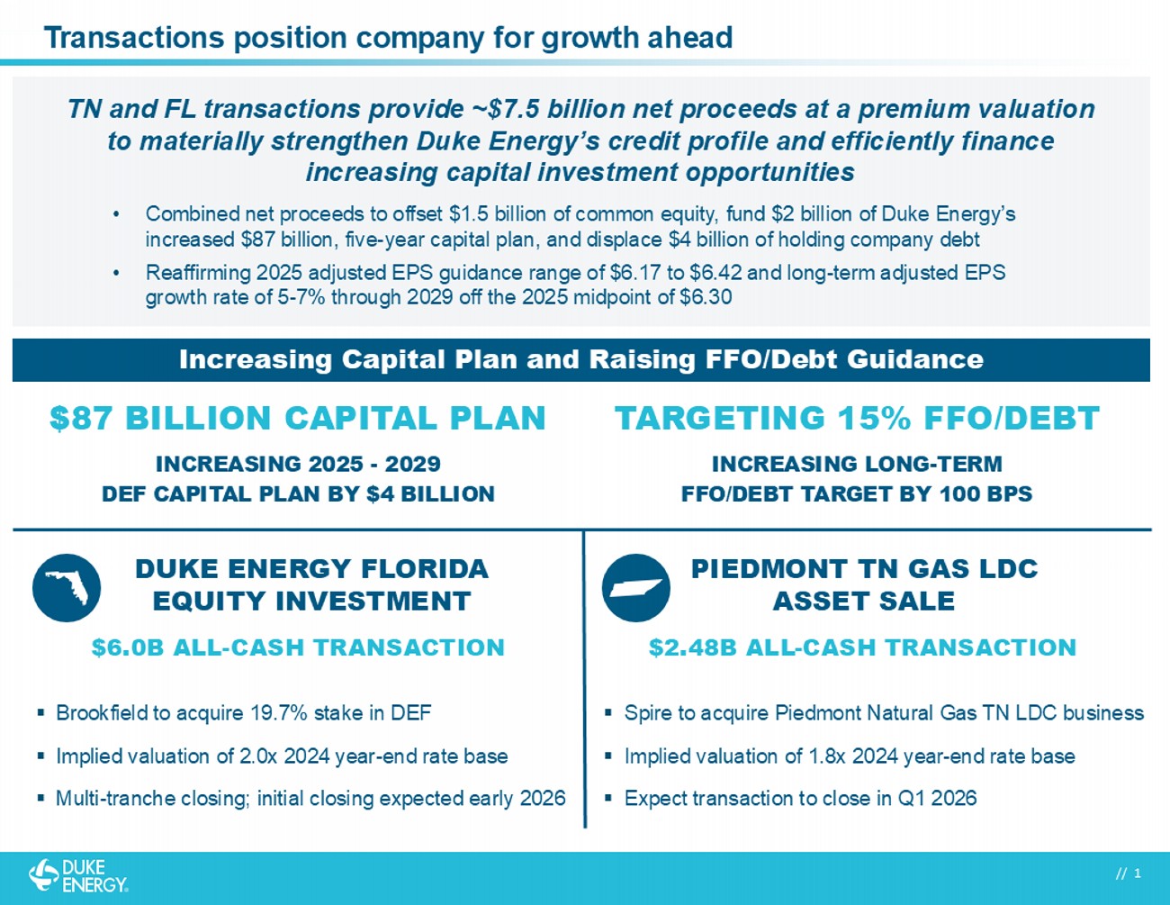 // 1 // 1 Transactions position company for growth ahead $87 BILLION CAPITAL PLAN INCREASING 2025 - 2029 DEF CAPITAL PLAN BY $4 BILLION DUKE ENERGY FLORIDA EQUITY INVESTMENT ▪ Brookfield to acquire 19.7% stake in DEF ▪ Implied valuation of 2.0x 2024 year - end rate base ▪ Multi - tranche closing; initial closing expected early 2026 ▪ Spire to acquire Piedmont Natural Gas TN LDC business ▪ Implied valuation of 1.8x 2024 year - end rate base ▪ Expect transaction to close in Q1 2026 PIEDMONT TN GAS LDC ASSET SALE $6.0B ALL - CASH TRANSACTION $2.48B ALL - CASH TRANSACTION TARGETING 15% FFO/DEBT INCREASING LONG - TERM FFO/DEBT TARGET BY 100 BPS Increasing Capital Plan and Raising FFO/Debt Guidance • Combined net proceeds to offset $1.5 billion of common equity, fund $2 billion of Duke Energy’s increased $87 billion, five - year capital plan, and displace $4 billion of holding company debt • Reaffirming 2025 adjusted EPS guidance range of $6.17 to $6.42 and long - term adjusted EPS growth rate of 5 - 7% through 2029 off the 2025 midpoint of $6.30 TN and FL transactions provide ~$7.5 billion net proceeds at a premium valuation to materially strengthen Duke Energy’s credit profile and efficiently finance increasing capital investment opportunities