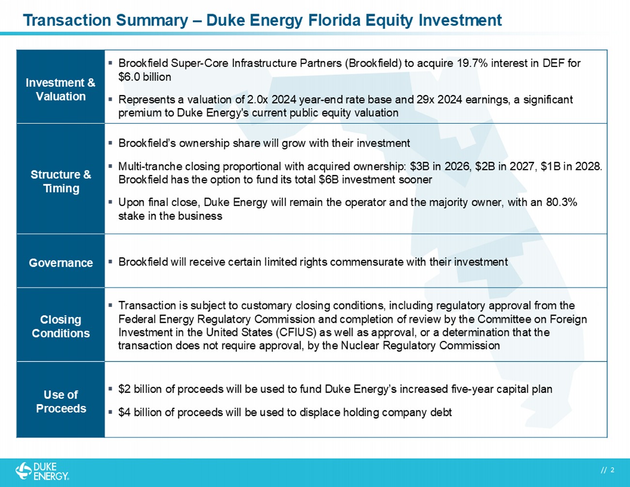 // 2 // 2 Transaction Summary – Duke Energy Florida Equity Investment ▪ Brookfield Super - Core Infrastructure Partners (Brookfield) to acquire 19.7% interest in DEF for $6.0 billion ▪ Represents a valuation of 2.0x 2024 year - end rate base and 29x 2024 earnings, a significant premium to Duke Energy's current public equity valuation Investment & Valuation ▪ Brookfield’s ownership share will grow with their investment ▪ Multi - tranche closing proportional with acquired ownership: $3B in 2026, $2B in 2027, $1B in 2028. Brookfield has the option to fund its total $6B investment sooner ▪ Upon final close, Duke Energy will remain the operator and the majority owner, with an 80.3% stake in the business Structure & Timing ▪ Brookfield will receive certain limited rights commensurate with their investment Governance ▪ Transaction is subject to customary closing conditions, including regulatory approval from the Federal Energy Regulatory Commission and completion of review by the Committee on Foreign Investment in the United States (CFIUS) as well as approval, or a determination that the transaction does not require approval, by the Nuclear Regulatory Commission Closing Conditions ▪ $2 billion of proceeds will be used to fund Duke Energy’s increased five - year capital plan ▪ $4 billion of proceeds will be used to displace holding company debt Use of Proceeds