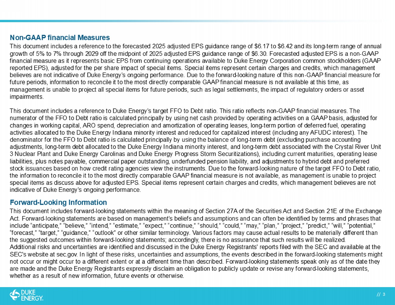 // 3 // 3 Non - GAAP financial Measures This document includes a reference to the forecasted 2025 adjusted EPS guidance range of $6.17 to $6.42 and its long - term range of annual growth of 5% to 7% through 2029 off the midpoint of 2025 adjusted EPS guidance range of $6.30. Forecasted adjusted EPS is a n on - GAAP financial measure as it represents basic EPS from continuing operations available to Duke Energy Corporation common stockhold ers (GAAP reported EPS), adjusted for the per share impact of special items. Special items represent certain charges and credits, which ma nagement believes are not indicative of Duke Energy’s ongoing performance. Due to the forward - looking nature of this non - GAAP financial m easure for future periods, information to reconcile it to the most directly comparable GAAP financial measure is not available at this t ime , as management is unable to project all special items for future periods, such as legal settlements, the impact of regulatory ord ers or asset impairments. This document includes a reference to Duke Energy’s target FFO to Debt ratio. This ratio reflects non - GAAP financial measures. T he numerator of the FFO to Debt ratio is calculated principally by using net cash provided by operating activities on a GAAP bas is, adjusted for changes in working capital, ARO spend, depreciation and amortization of operating leases, long - term portion of deferred fuel, op erating activities allocated to the Duke Energy Indiana minority interest and reduced for capitalized interest (including any AFUDC i nte rest). The denominator for the FFO to Debt ratio is calculated principally by using the balance of long - term debt (excluding purchase accou nting adjustments, long - term debt allocated to the Duke Energy Indiana minority interest, and long - term debt associated with the Cryst al River Unit 3 Nuclear Plant and Duke Energy Carolinas and Duke Energy Progress Storm Securitizations), including current maturities, oper ati ng lease liabilities, plus notes payable, commercial paper outstanding, underfunded pension liability, and adjustments to hybrid debt and preferred stock issuances based on how credit rating agencies view the instruments. Due to the forward - looking nature of the target FFO to Debt ratio, the information to reconcile it to the most directly comparable GAAP financial measure is not available, as management is una ble to project special items as discuss above for adjusted EPS. Special items represent certain charges and credits, which management believ es are not indicative of Duke Energy’s ongoing performance. Forward - Looking Information This document includes forward - looking statements within the meaning of Section 27A of the Securities Act and Section 21E of the Exchange Act. Forward - looking statements are based on management’s beliefs and assumptions and can often be identified by terms and phras es that include “anticipate,” “believe,” “intend,” “estimate,” “expect,” “continue,” “should,” “could,” “may,” “plan,” “project,” “pr edi ct,” “will,” “potential,” “forecast,” “target,” “guidance,” “outlook” or other similar terminology. Various factors may cause actual results to be mate ria lly different than the suggested outcomes within forward - looking statements; accordingly, there is no assurance that such results will be realized. Additional risks and uncertainties are identified and discussed in the Duke Energy Registrants' reports filed with the SEC an d a vailable at the SEC's website at sec.gov. In light of these risks, uncertainties and assumptions, the events described in the forward - looking st atements might not occur or might occur to a different extent or at a different time than described. Forward - looking statements speak only as o f the date they are made and the Duke Energy Registrants expressly disclaim an obligation to publicly update or revise any forward - looking state ments, whether as a result of new information, future events or otherwise.