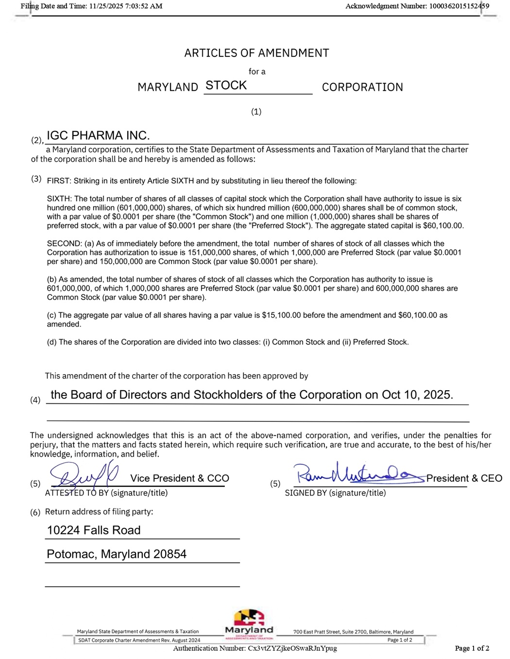Vice President & CCO President & CEO Acknowledgment Number: 1000362015152459 Filing Date and Time: 11/25/2025 7:03:52 AM Authentication Number: Cx3vtZYZjkeOSwaRJnYpug Page 1 of 2