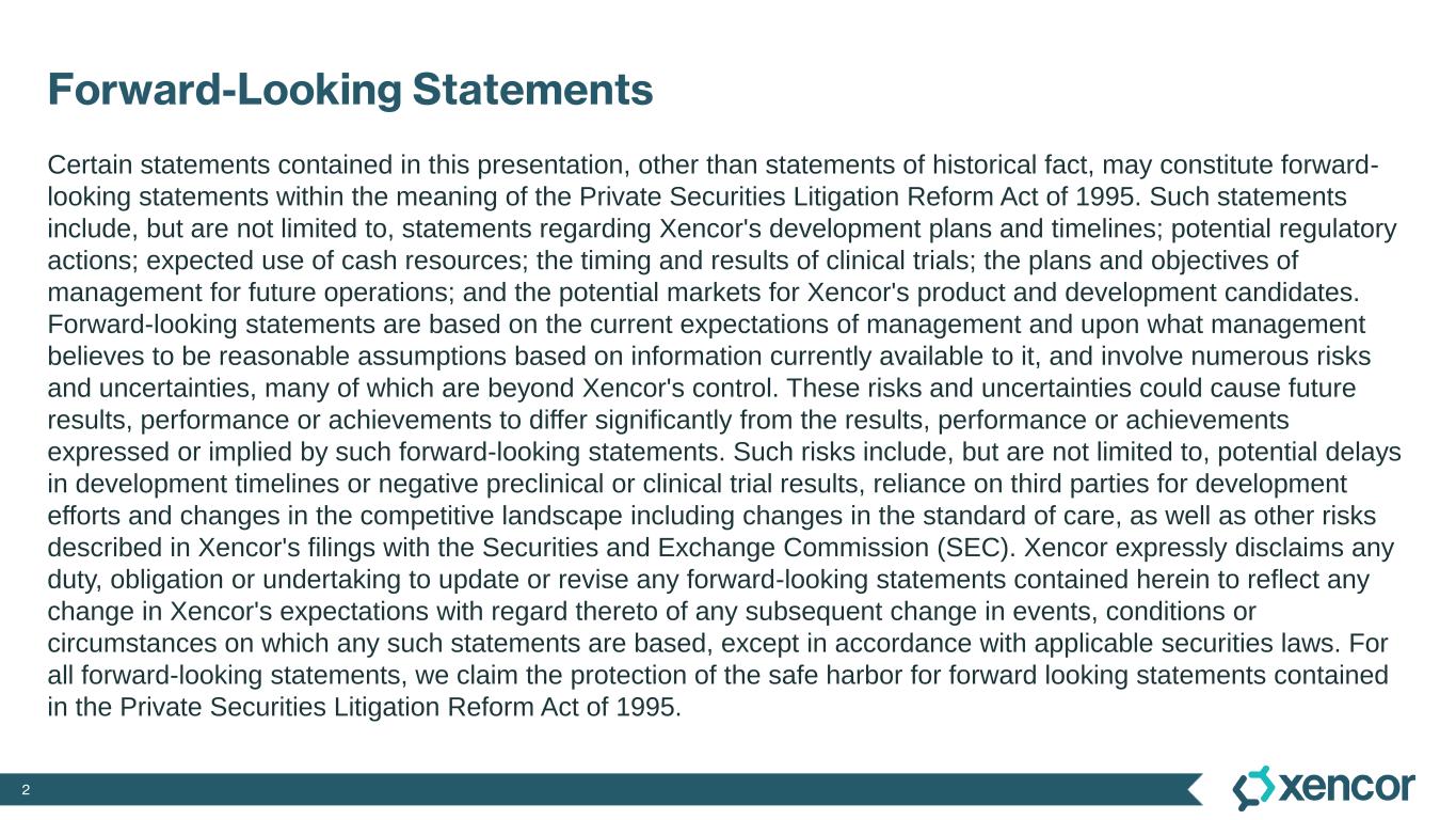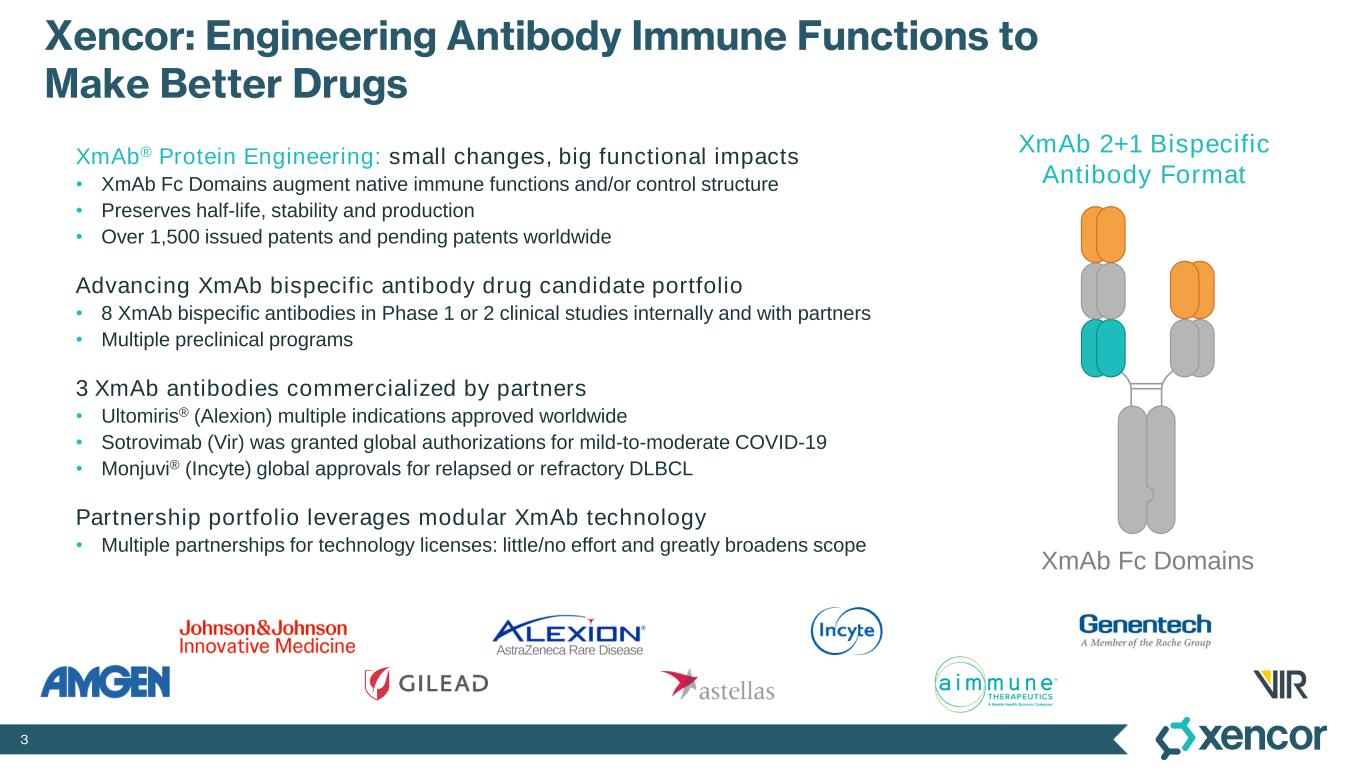 2 Forward-Looking Statements Certain statements contained in this presentation, other than statements of historical fact, may constitute forward- looking statements within the meaning of the Private Securities Litigation Reform Act of 1995. Such statements include, but are not limited to, statements regarding Xencor's development plans and timelines; potential regulatory actions; expected use of cash resources; the timing and results of clinical trials; the plans and objectives of management for future operations; and the potential markets for Xencor's product and development candidates. Forward-looking statements are based on the current expectations of management and upon what management believes to be reasonable assumptions based on information currently available to it, and involve numerous risks and uncertainties, many of which are beyond Xencor's control. These risks and uncertainties could cause future results, performance or achievements to differ significantly from the results, performance or achievements expressed or implied by such forward-looking statements. Such risks include, but are not limited to, potential delays in development timelines or negative preclinical or clinical trial results, reliance on third parties for development efforts and changes in the competitive landscape including changes in the standard of care, as well as other risks described in Xencor's filings with the Securities and Exchange Commission (SEC). Xencor expressly disclaims any duty, obligation or undertaking to update or revise any forward-looking statements contained herein to reflect any change in Xencor's expectations with regard thereto of any subsequent change in events, conditions or circumstances on which any such statements are based, except in accordance with applicable securities laws. For all forward-looking statements, we claim the protection of the safe harbor for forward looking statements contained in the Private Securities Litigation Reform Act of 1995.