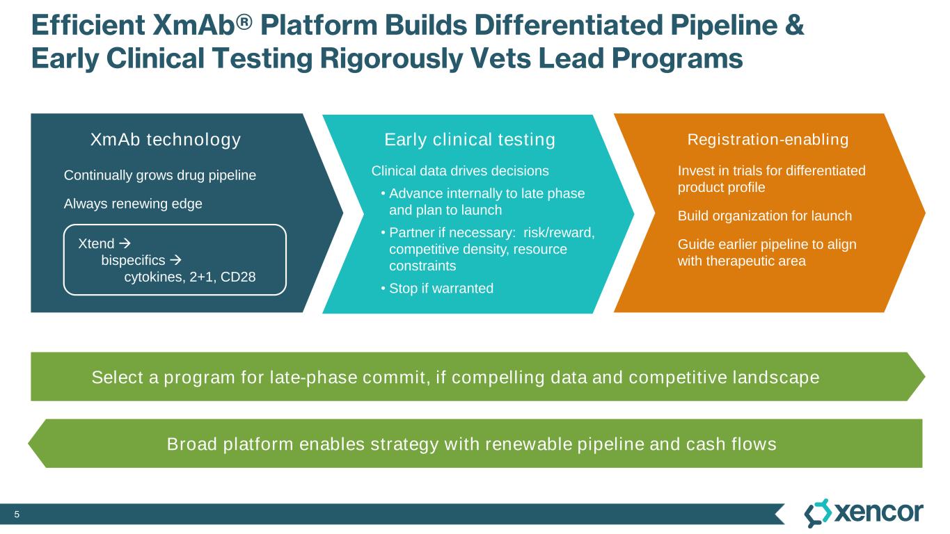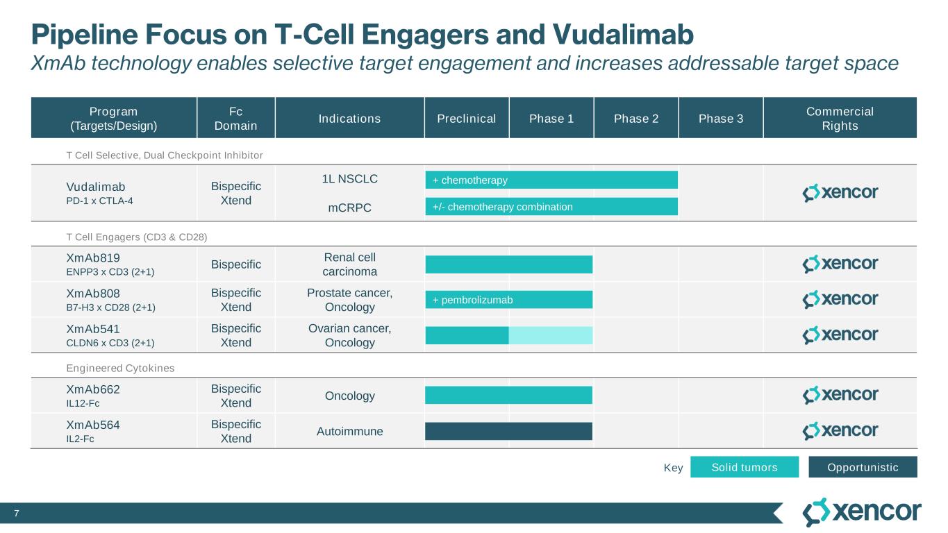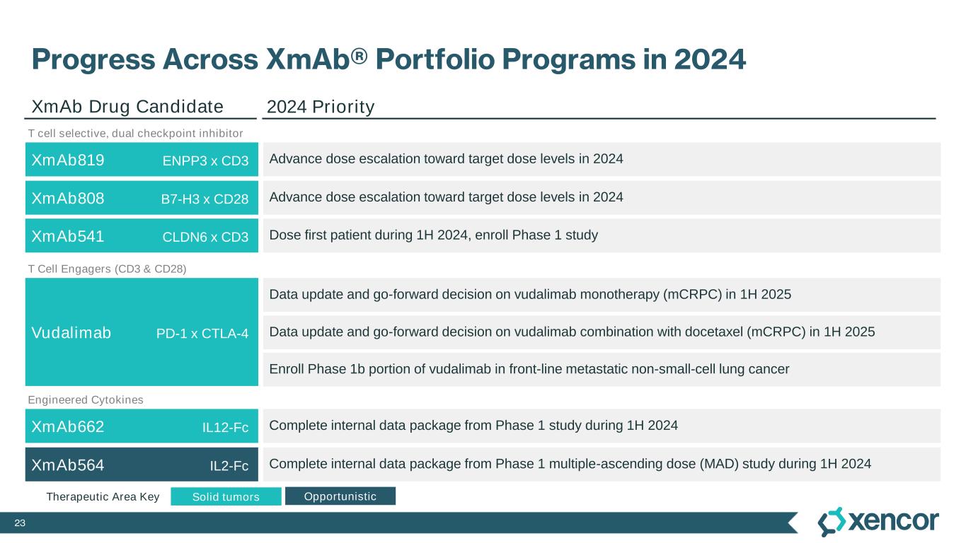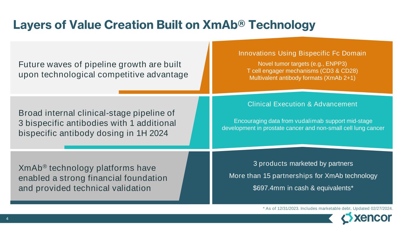 4 Layers of Value Creation Built on XmAb® Technology XmAb® technology platforms have enabled a strong financial foundation and provided technical validation Broad internal clinical-stage pipeline of 3 bispecific antibodies with 1 additional bispecific antibody dosing in 1H 2024 Future waves of pipeline growth are built upon technological competitive advantage Clinical Execution & Advancement Innovations Using Bispecific Fc Domain Novel tumor targets (e.g., ENPP3) T cell engager mechanisms (CD3 & CD28) Multivalent antibody formats (XmAb 2+1) Encouraging data from vudalimab support mid-stage development in prostate cancer and non-small cell lung cancer * As of 12/31/2023. Includes marketable debt. Updated 02/27/2024. 3 products marketed by partners More than 15 partnerships for XmAb technology $697.4mm in cash & equivalents*