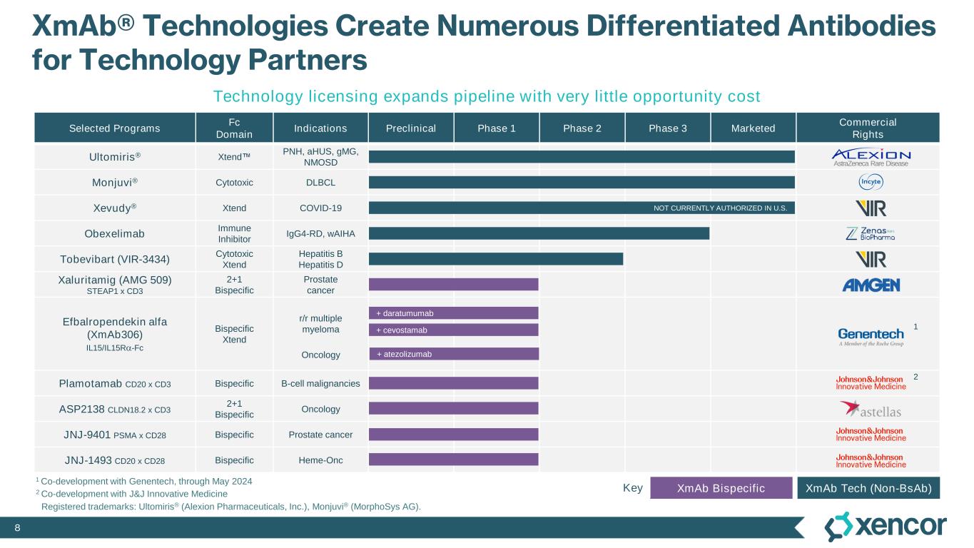 7 Pipeline Focus on T-Cell Engagers and Vudalimab XmAb technology enables selective target engagement and increases addressable target space Program (Targets/Design) Fc Domain Indications Preclinical Phase 1 Phase 2 Phase 3 Commercial Rights T Cell Selective, Dual Checkpoint Inhibitor Vudalimab PD-1 x CTLA-4 Bispecific Xtend 1L NSCLC mCRPC T Cell Engagers (CD3 & CD28) XmAb819 ENPP3 x CD3 (2+1) Bispecific Renal cell carcinoma XmAb808 B7-H3 x CD28 (2+1) Bispecific Xtend Prostate cancer, Oncology XmAb541 CLDN6 x CD3 (2+1) Bispecific Xtend Ovarian cancer, Oncology Engineered Cytokines XmAb662 IL12-Fc Bispecific Xtend Oncology XmAb564 IL2-Fc Bispecific Xtend Autoimmune +/- chemotherapy combination Solid tumors Opportunistic + pembrolizumab + chemotherapy Key
