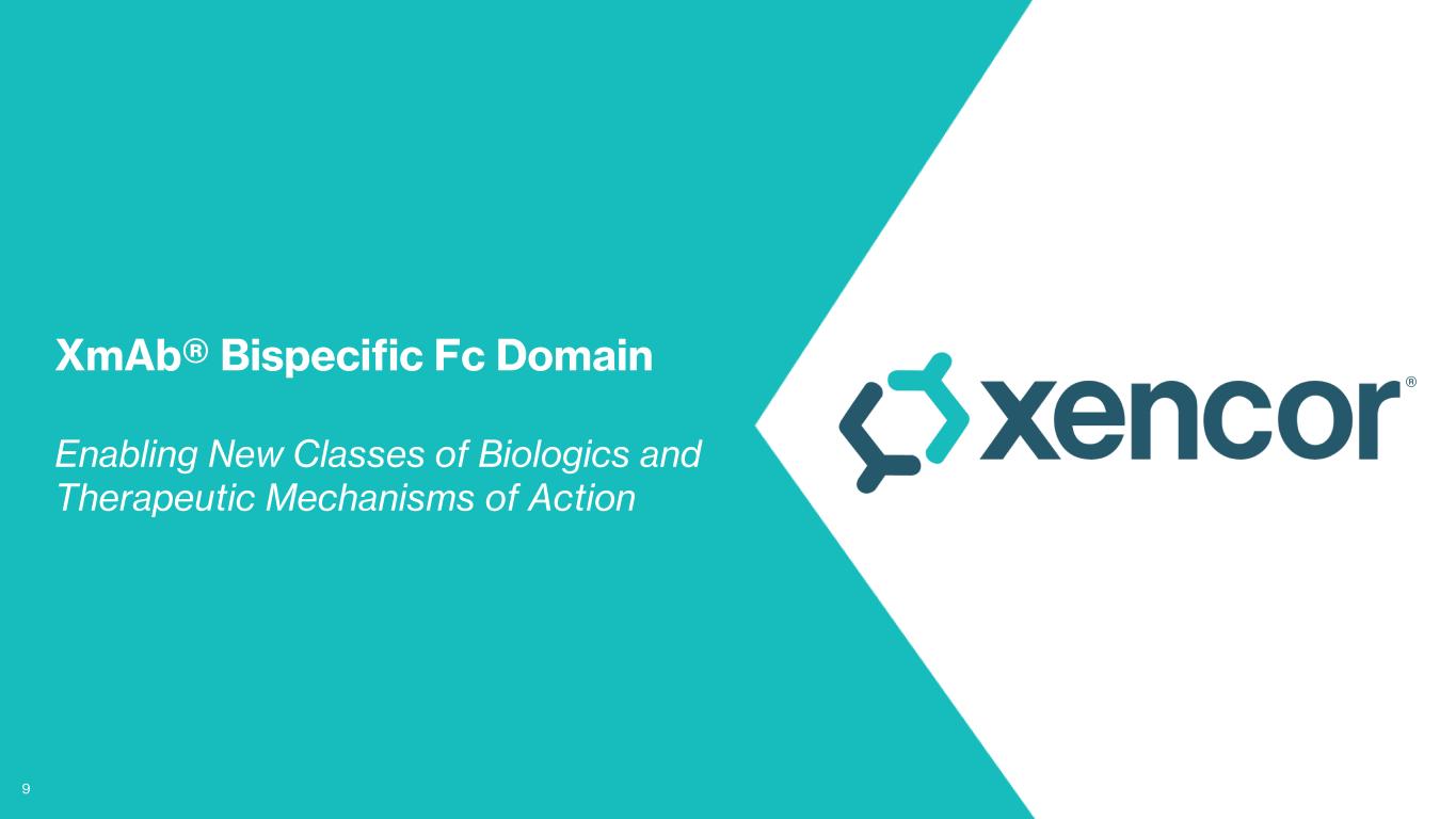 8 XmAb® Technologies Create Numerous Differentiated Antibodies for Technology Partners Selected Programs Fc Domain Indications Preclinical Phase 1 Phase 2 Phase 3 Marketed Commercial Rights Ultomiris® Xtend PNH, aHUS, gMG, NMOSD Monjuvi® Cytotoxic DLBCL Xevudy® Xtend COVID-19 Obexelimab Immune Inhibitor IgG4-RD, wAIHA Tobevibart (VIR-3434) Cytotoxic Xtend Hepatitis B Hepatitis D Xaluritamig (AMG 509) STEAP1 x CD3 2+1 Bispecific Prostate cancer Efbalropendekin alfa (XmAb306) IL15/IL15Ra-Fc Bispecific Xtend r/r multiple myeloma Oncology Plamotamab CD20 x CD3 Bispecific B-cell malignancies ASP2138 CLDN18.2 x CD3 2+1 Bispecific Oncology JNJ-9401 PSMA x CD28 Bispecific Prostate cancer JNJ-1493 CD20 x CD28 Bispecific Heme-Onc Technology licensing expands pipeline with very little opportunity cost NOT CURRENTLY AUTHORIZED IN U.S. Registered trademarks: Ultomiris® (Alexion Pharmaceuticals, Inc.), Monjuvi® (MorphoSys AG). AstraZeneca Rare Disease + cevostamab + daratumumab + atezolizumab 2 Co-development with J&J Innovative Medicine 1 Co-development with Genentech, through May 2024 1 2 XmAb BispecificKey XmAb Tech (Non-BsAb)