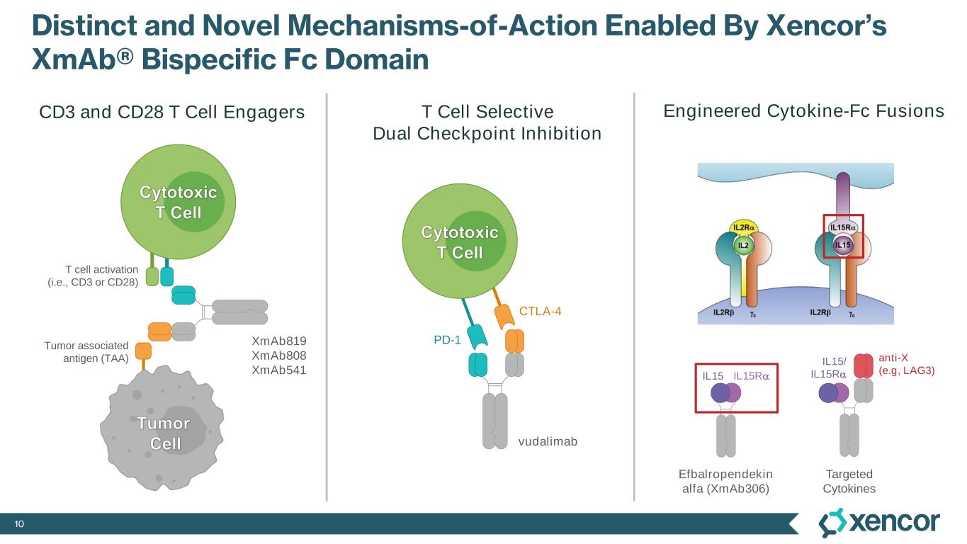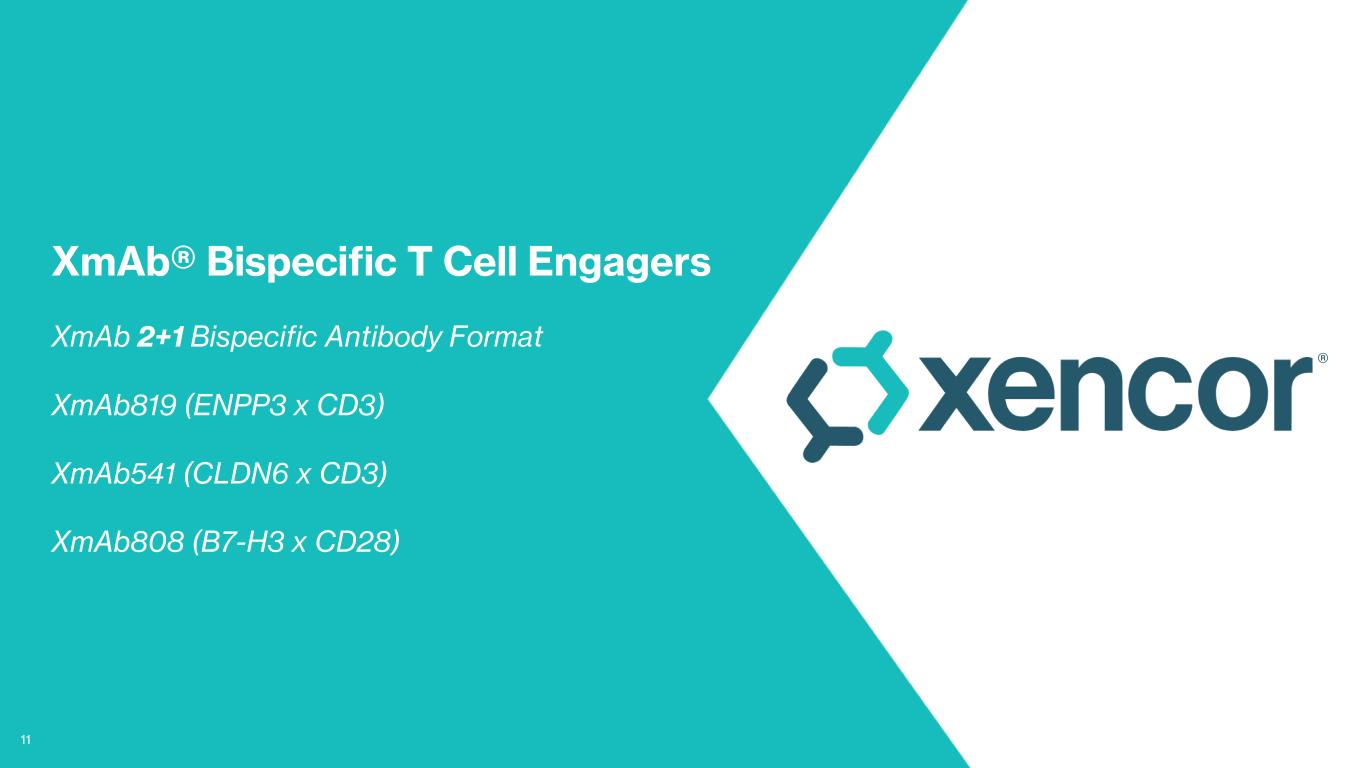 10 Distinct and Novel Mechanisms-of-Action Enabled By Xencor’s XmAb® Bispecific Fc Domain PD-1 CTLA-4 Tumor associated antigen (TAA) vudalimab Efbalropendekin alfa (XmAb306) Targeted Cytokines Tumor Cell Cytotoxic T Cell CD3 and CD28 T Cell Engagers T cell activation (i.e., CD3 or CD28) T Cell Selective Dual Checkpoint Inhibition XmAb819 XmAb808 XmAb541 Cytotoxic T Cell Engineered Cytokine-Fc Fusions anti-X (e.g, LAG3) IL15/ IL15RaIL15 IL15Ra