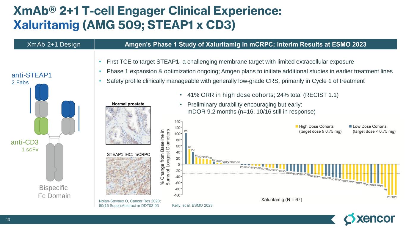 12 XmAb® T Cell Engagers Use Multiple Formats and Affinity Designs to Customize for Each Tumor Target 1 ScFv Targets: CD3 or CD28 Targets: tumor antigen (e.g., ENPP3, STEAP1, Claudin 18.2, B7-H3) Targets: tumor antigen (e.g., CD20, CD38) Examples Xaluritamig CD3 ASP2138 CD3 XmAb819 CD3 XmAb541 CD3 CD3 affinity tuned for reduction of cytokine release syndrome and off-tumor cell killing Tumor antigen binding affinity tuned for tumor expression density and to match format Tuned 2+1 Format = Selective Reactivity Example Plamotamab CD3 1 scFv Targets: CD3 or CD28 1 Fab 2 Fabs XmAb808 CD28 XmAb® 2+1XmAb® 1+1