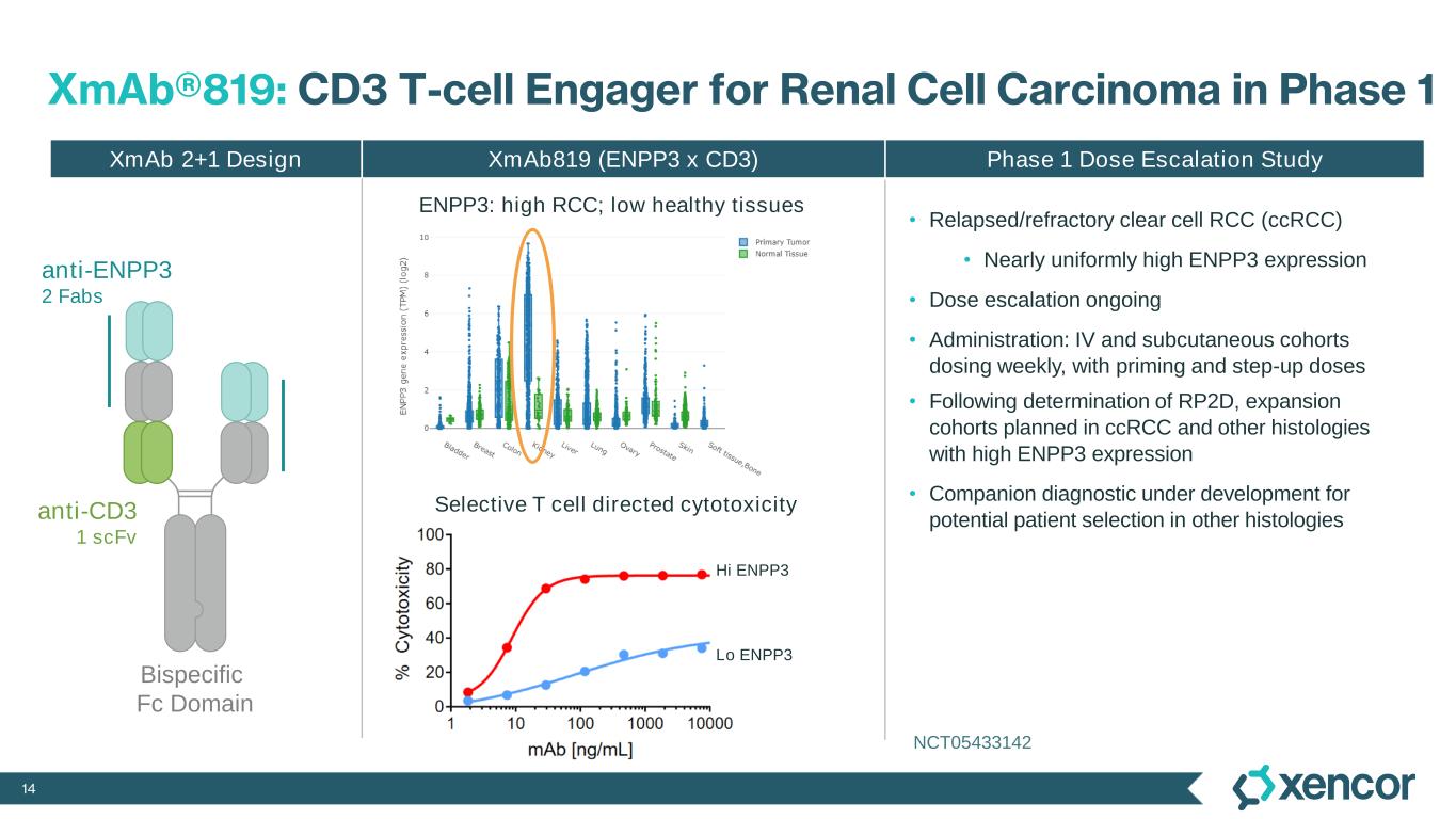 13 XmAb® 2+1 T-cell Engager Clinical Experience: Xaluritamig (AMG 509; STEAP1 x CD3) • First TCE to target STEAP1, a challenging membrane target with limited extracellular exposure • Phase 1 expansion & optimization ongoing; Amgen plans to initiate additional studies in earlier treatment lines • Safety profile clinically manageable with generally low-grade CRS, primarily in Cycle 1 of treatment anti-CD3 1 scFv Bispecific Fc Domain anti-STEAP1 2 Fabs STEAP1 IHC: mCRPC Nolan-Stevaux O, Cancer Res 2020; 80(16 Suppl):Abstract nr DDT02-03​ Normal prostate​ • 41% ORR in high dose cohorts; 24% total (RECIST 1.1) • Preliminary durability encouraging but early: mDOR 9.2 months (n=16, 10/16 still in response) Kelly, et al. ESMO 2023. Amgen’s Phase 1 Study of Xaluritamig in mCRPC; Interim Results at ESMO 2023 XmAb 2+1 Design