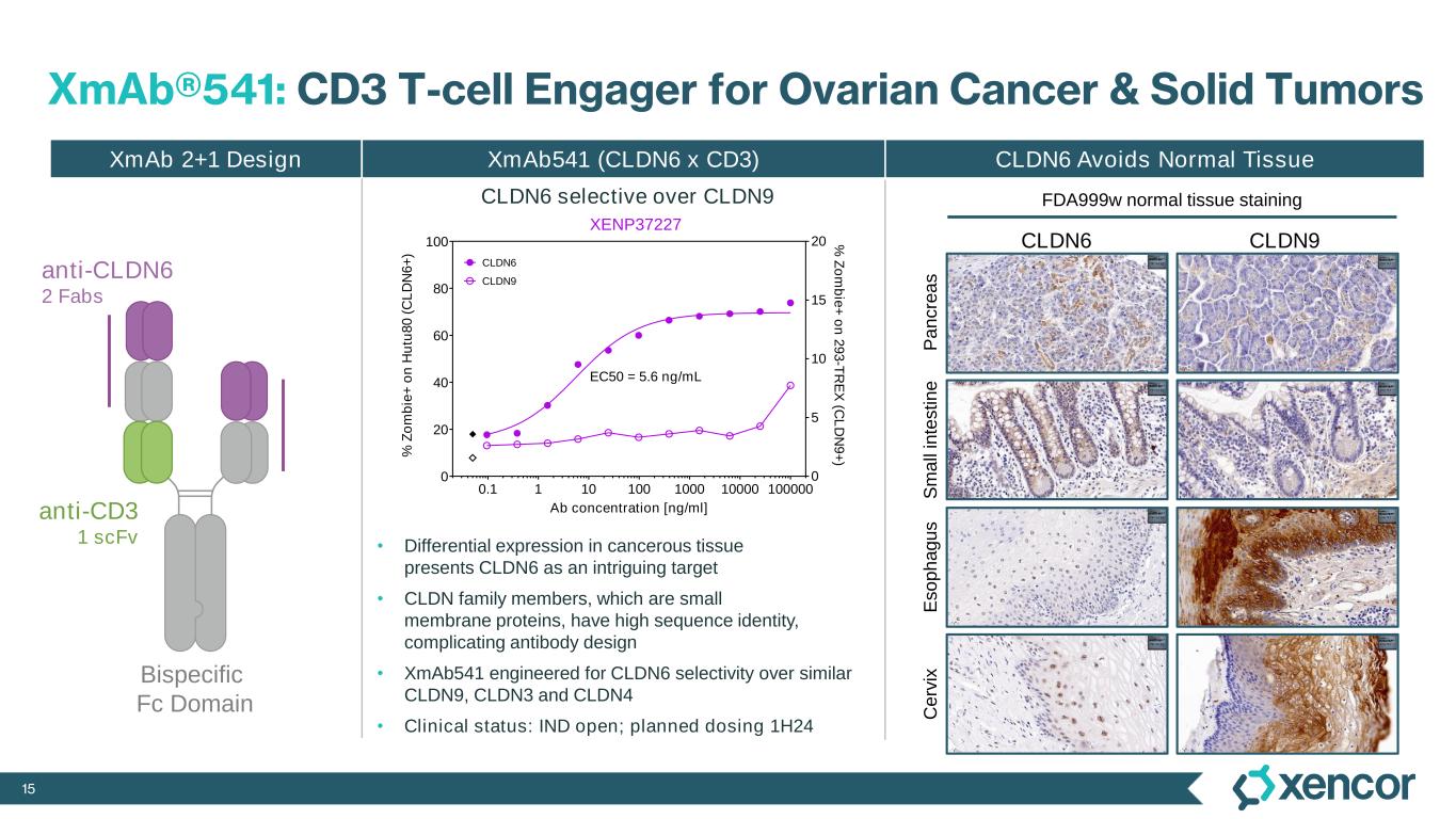 14 XmAb®819: CD3 T-cell Engager for Renal Cell Carcinoma in Phase 1 XmAb819 (ENPP3 x CD3) Phase 1 Dose Escalation Study Selective T cell directed cytotoxicity Hi ENPP3 Lo ENPP3 XmAb 2+1 Design ENPP3: high RCC; low healthy tissues • Relapsed/refractory clear cell RCC (ccRCC) • Nearly uniformly high ENPP3 expression • Dose escalation ongoing • Administration: IV and subcutaneous cohorts dosing weekly, with priming and step-up doses • Following determination of RP2D, expansion cohorts planned in ccRCC and other histologies with high ENPP3 expression • Companion diagnostic under development for potential patient selection in other histologiesanti-CD3 1 scFv Bispecific Fc Domain anti-ENPP3 2 Fabs NCT05433142