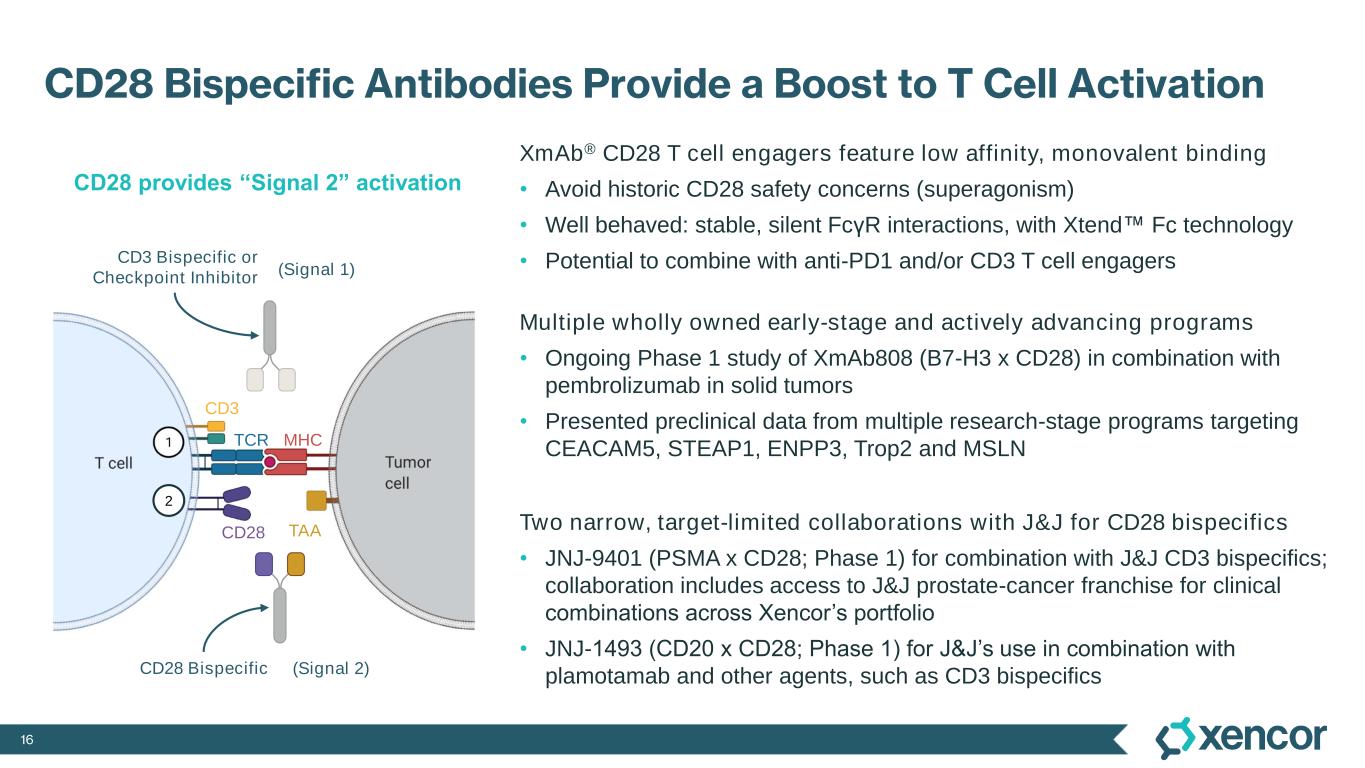 15 XmAb®541: CD3 T-cell Engager for Ovarian Cancer & Solid Tumors XmAb541 (CLDN6 x CD3) CLDN6 Avoids Normal TissueXmAb 2+1 Design 0.1 1 10 100 1000 10000 100000 0 20 40 60 80 100 0 5 10 15 20 Ab concentration [ng/ml] % Z o m b ie + o n H u tu 8 0 ( C L D N 6 + ) % Z o m b ie + o n 2 9 3 -T R E X (C L D N 9 + ) EC50 = 5.6 ng/mL XENP37227 CLDN9 CLDN6 0.1 1 10 100 1000 10000 100000 0 20 40 60 80 100 0 5 10 15 20 Ab concentration [ng/ml] % Z o m b ie + o n H u tu 8 0 ( C L D N 6 + ) % Z o m b ie + o n 2 9 3 -T R E X (C L D N 9 + ) CLDN6 CLDN9 EC50 = 22.8 ng/mL XENP35386 (H1L1 - parental) CLDN6 selective over CLDN9 CLDN6 CLDN9 P a n c re a s S m a ll in te s ti n e E s o p h a g u s C e rv ix FDA999w normal tissue staining • Differential expression in cancerous tissue presents CLDN6 as an intriguing target • CLDN family members, which are small membrane proteins, have high sequence identity, complicating antibody design • XmAb541 engineered for CLDN6 selectivity over similar CLDN9, CLDN3 and CLDN4 • Clinical status: IND open; planned dosing 1H24 anti-CD3 1 scFv Bispecific Fc Domain anti-CLDN6 2 Fabs