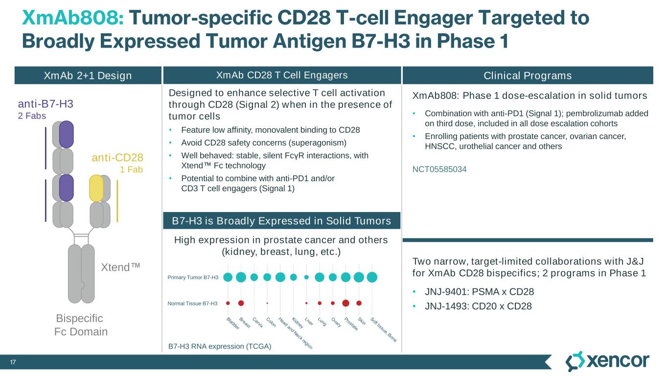16 CD28 Bispecific Antibodies Provide a Boost to T Cell Activation XmAb® CD28 T cell engagers feature low affinity, monovalent binding • Avoid historic CD28 safety concerns (superagonism) • Well behaved: stable, silent FcγR interactions, with Xtend Fc technology • Potential to combine with anti-PD1 and/or CD3 T cell engagers Multiple wholly owned early-stage and actively advancing programs • Ongoing Phase 1 study of XmAb808 (B7-H3 x CD28) in combination with pembrolizumab in solid tumors • Presented preclinical data from multiple research-stage programs targeting CEACAM5, STEAP1, ENPP3, Trop2 and MSLN Two narrow, target-limited collaborations with J&J for CD28 bispecifics • JNJ-9401 (PSMA x CD28; Phase 1) for combination with J&J CD3 bispecifics; collaboration includes access to J&J prostate-cancer franchise for clinical combinations across Xencor’s portfolio • JNJ-1493 (CD20 x CD28; Phase 1) for J&J’s use in combination with plamotamab and other agents, such as CD3 bispecifics CD28 provides “Signal 2” activation (Signal 1) (Signal 2) TAA 2 CD3 Bispecific or Checkpoint Inhibitor CD28 CD3 TCR MHC CD28 Bispecific