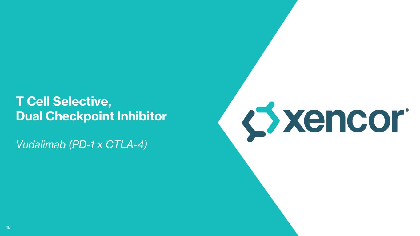 17 XmAb808: Tumor-specific CD28 T-cell Engager Targeted to Broadly Expressed Tumor Antigen B7-H3 in Phase 1 Clinical Programs XmAb808: Phase 1 dose-escalation in solid tumors • Combination with anti-PD1 (Signal 1); pembrolizumab added on third dose, included in all dose escalation cohorts • Enrolling patients with prostate cancer, ovarian cancer, HNSCC, urothelial cancer and others Two narrow, target-limited collaborations with J&J for XmAb CD28 bispecifics; 2 programs in Phase 1 • JNJ-9401: PSMA x CD28 • JNJ-1493: CD20 x CD28 anti-CD28 1 Fab anti-B7-H3 2 Fabs Xtend Bispecific Fc Domain XmAb 2+1 Design B7-H3 is Broadly Expressed in Solid Tumors High expression in prostate cancer and others (kidney, breast, lung, etc.) XmAb CD28 T Cell Engagers B7-H3 RNA expression (TCGA) Primary Tumor B7-H3 Normal Tissue B7-H3 NCT05585034 Designed to enhance selective T cell activation through CD28 (Signal 2) when in the presence of tumor cells • Feature low affinity, monovalent binding to CD28 • Avoid CD28 safety concerns (superagonism) • Well behaved: stable, silent FcγR interactions, with Xtend Fc technology • Potential to combine with anti-PD1 and/or CD3 T cell engagers (Signal 1)
