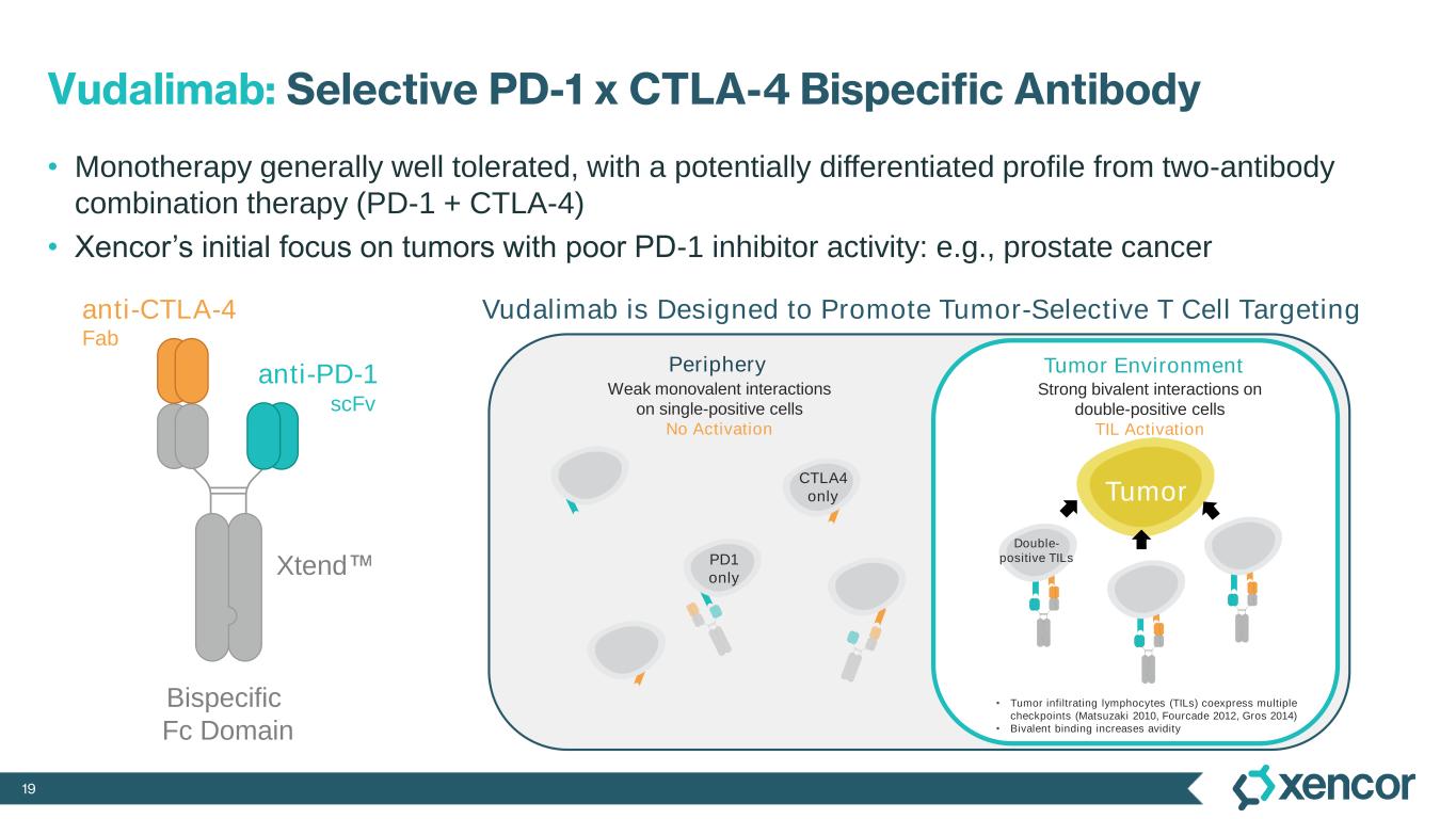 19 Vudalimab: Selective PD-1 x CTLA-4 Bispecific Antibody • Monotherapy generally well tolerated, with a potentially differentiated profile from two-antibody combination therapy (PD-1 + CTLA-4) • Xencor’s initial focus on tumors with poor PD-1 inhibitor activity: e.g., prostate cancer anti-PD-1 scFv anti-CTLA-4 Fab Xtend Bispecific Fc Domain • Tumor infiltrating lymphocytes (TILs) coexpress multiple checkpoints (Matsuzaki 2010, Fourcade 2012, Gros 2014) • Bivalent binding increases avidity Periphery Strong bivalent interactions on double-positive cells TIL Activation Weak monovalent interactions on single-positive cells No Activation Tumor Environment  Tumor PD1 only CTLA4 only Double- positive TILs Vudalimab is Designed to Promote Tumor-Selective T Cell Targeting