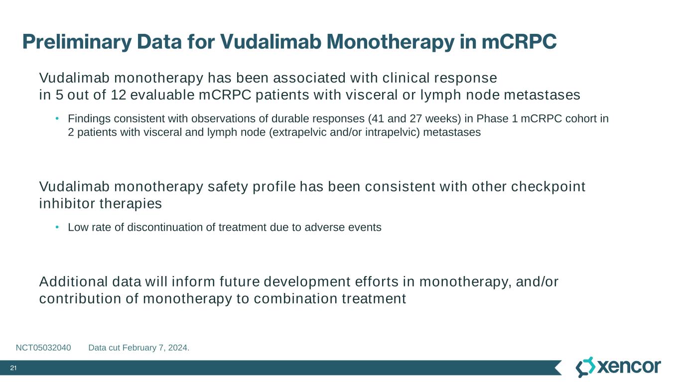 20 Evolution of Vudalimab Development Program for mCRPC 2021 2022 2023 2024 Phase 2 Vudalimab + chemotherapy or PARPi in molecularly defined mCRPC Phase 2 Vudalimab monotherapy in high-risk mCRPC cohort Phase 1 Vudalimab dose-escalation and expansion study in mixed solid tumors mCRPC Cohort in Study XmAb717-05 • Visceral, soft tissue, or lymph node metastases (“high-risk” mCRPC) • Measurable disease by RECIST 1.1 • Progressed after all approved, medically appropriate therapies • < 2 prior chemotherapy regimens • No prior treatment with anti-CTLA-4 or PD-1 Study status (February 7, 2024) • 14/30 mCRPC patients enrolled Study: DUET-2 Study: XmAb717-04 Study: XmAb717-05 Vudalimab Q3W flat dose schedule: 1000 (< 80 kg) or 1200 mg (≥ 80 kg) IV
