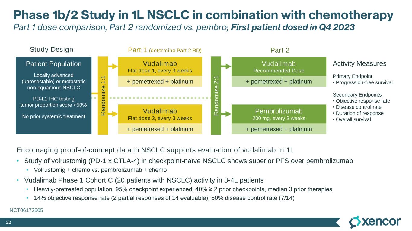 21 Preliminary Data for Vudalimab Monotherapy in mCRPC Vudalimab monotherapy has been associated with clinical response in 5 out of 12 evaluable mCRPC patients with visceral or lymph node metastases • Findings consistent with observations of durable responses (41 and 27 weeks) in Phase 1 mCRPC cohort in 2 patients with visceral and lymph node (extrapelvic and/or intrapelvic) metastases Vudalimab monotherapy safety profile has been consistent with other checkpoint inhibitor therapies • Low rate of discontinuation of treatment due to adverse events Additional data will inform future development efforts in monotherapy, and/or contribution of monotherapy to combination treatment NCT05032040 Data cut February 7, 2024.