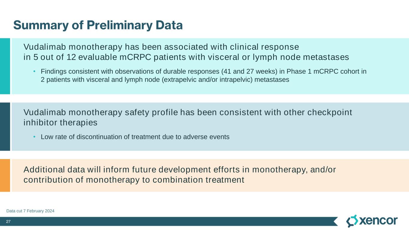 26 Evolution of Vudalimab Development Program for mCRPC 2021 2022 2023 2024 Phase 2 Vudalimab + chemotherapy or PARPi in molecularly defined mCRPC Phase 2 Vudalimab monotherapy in high-risk mCRPC cohort Phase 1 Vudalimab dose-escalation and expansion study in mixed solid tumors mCRPC Cohort in Study XmAb717-05 • Visceral, soft tissue, or lymph node metastases (“high-risk” mCRPC) • Measurable disease by RECIST 1.1 • Progressed after all approved, medically appropriate therapies • < 2 prior chemotherapy regimens • No prior treatment with anti-CTLA-4 or PD-1 Study status • 14/30 mCRPC patients enrolled Study: DUET-2 Study: XmAb717-04 Study: XmAb717-05 Vudalimab Q3W flat dose schedule: 1000 (< 80 kg) or 1200 mg (≥ 80 kg) IV