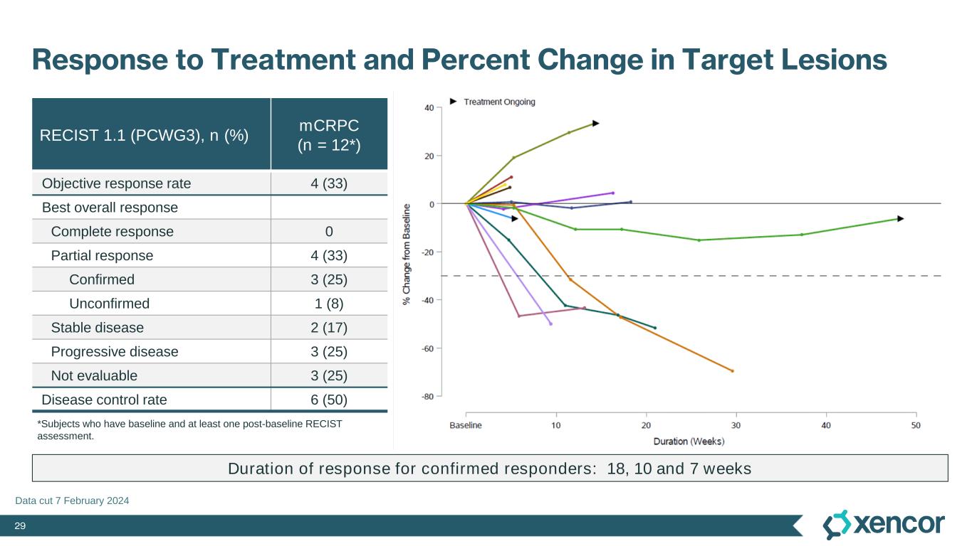 28 Demographics and Baseline Characteristics and Prior Treatment Data cut 7 February 2024 Characteristic mCRPC (n = 14) Age, median (range) 72 (58-89) Liver or Lung metastases at baseline, (%) 6 (42.9) PSA (ng/ml) at baseline, median (range) 152.9 (35-1873) ECOG 1, n (%) 12 (85.7) Metastatic disease at diagnosis, n (%) 11 (78.6) Prior Treatment mCRPC (n = 14) Median (range) lines of prior therapy 4 (2-8) Chemotherapy, n (%) 13 (92.8) Lines of chemotherapy, median (range) 1 (1-2) Prior AR Therapy 14 (100.0) Abiraterone, n (%) 11 (78.6) Enzalutamide, n (%) 8 (57.1) Lu-177 PSMA, n (%) 4 (28.6) Prior radiation, n (%) 9 (64.3)