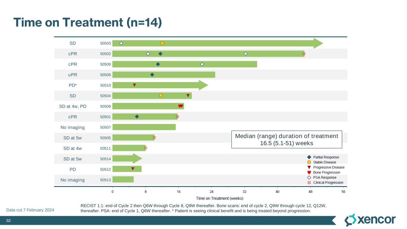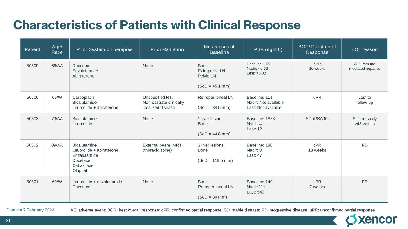31 Characteristics of Patients with Clinical Response Patient Age/ Race Prior Systemic Therapies Prior Radiation Metastases at Baseline PSA (ng/mL) BOR/ Duration of Response EOT reason 50509 66/AA Docetaxel Enzalutamide Abiraterone None Bone Extrapelvic LN Pelvic LN (SoD = 45.1 mm) Baseline: 165 Nadir: <0.02 Last: <0.02 cPR 10 weeks AE: Immune mediated hepatitis 50506 69/W Carboplatin Bicalutamide Leuprolide + abiraterone Unspecified RT: Non-castrate clinically localized disease Retroperitoneal LN (SoD = 34.5 mm) Baseline: 111 Nadir: Not available Last: Not available uPR Lost to follow up 50503 79/AA Bicalutamide Leuprolide None 1 liver lesion Bone (SoD = 44.8 mm) Baseline: 1873 Nadir: 4 Last: 12 SD (PSA90) Still on study >48 weeks 50502 89/AA Bicalutamide Leuprolide + abiraterone Enzalutamide Docetaxel Cabazitaxel Olaparib External beam IMRT (thoracic spine) 3 liver lesions Bone (SoD = 118.5 mm) Baseline: 180 Nadir: 8 Last: 47 cPR 18 weeks PD 50501 60/W Leuprolide + enzalutamide Docetaxel None Bone Retroperitoneal LN (SoD = 30 mm) Baseline: 140 Nadir:211 Last: 549 cPR 7 weeks PD AE: adverse event; BOR: best overall response; cPR: confirmed partial response; SD: stable disease; PD: progressive disease; uPR: unconfirmed partial response Data cut 7 February 2024