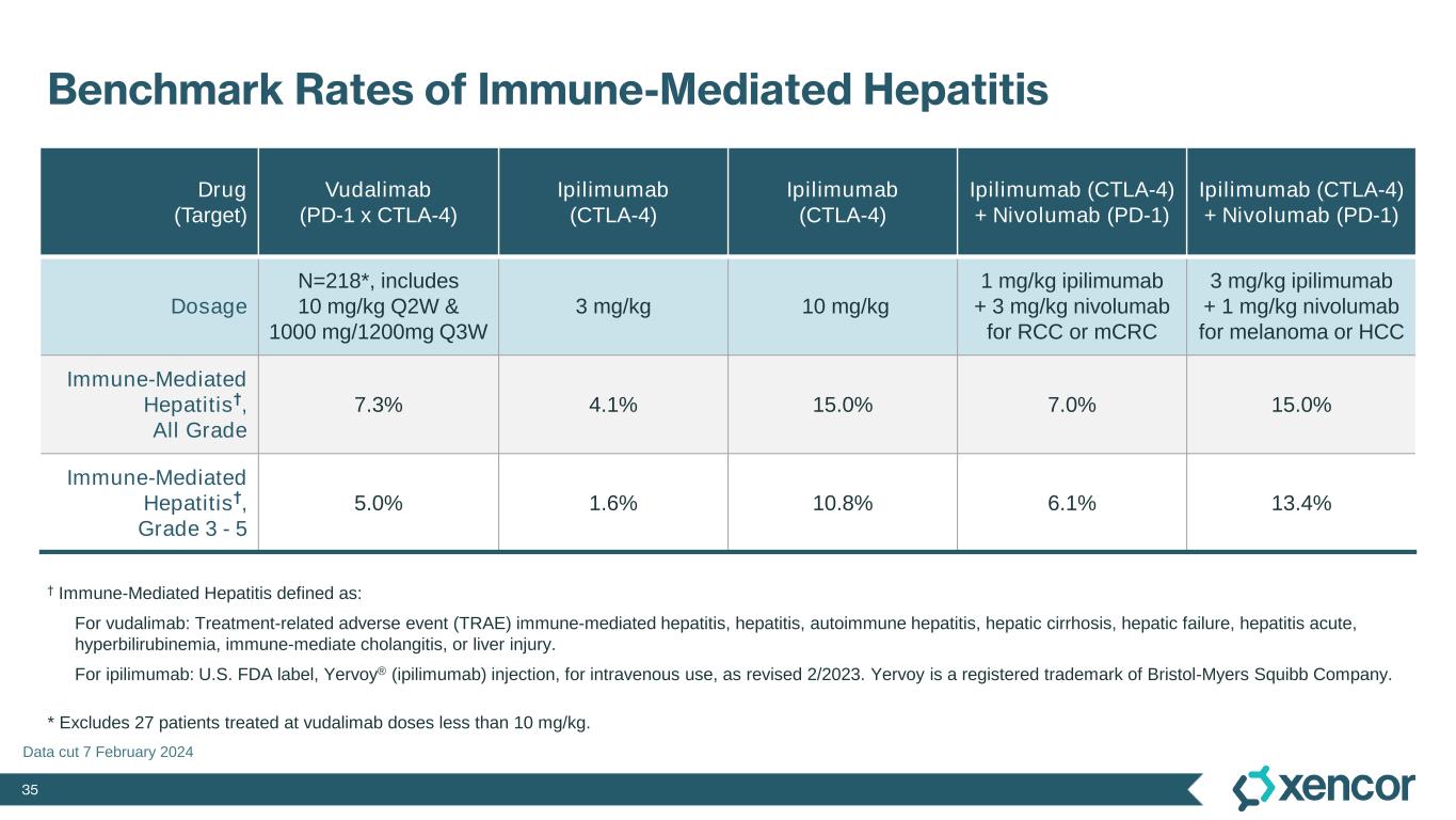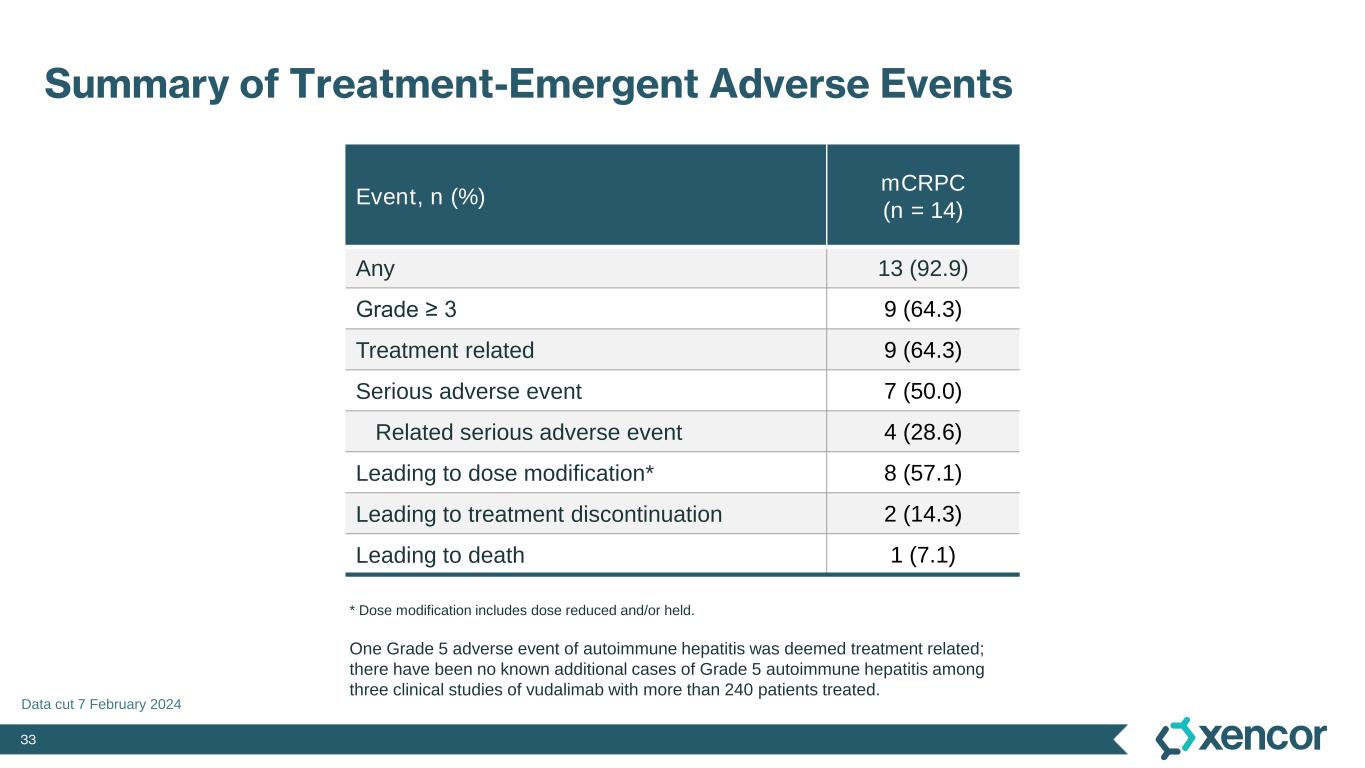 33 Summary of Treatment-Emergent Adverse Events Event, n (%) mCRPC (n = 14) Any 13 (92.9) Grade ≥ 3 9 (64.3) Treatment related 9 (64.3) Serious adverse event 7 (50.0) Related serious adverse event 4 (28.6) Leading to dose modification* 8 (57.1) Leading to treatment discontinuation 2 (14.3) Leading to death 1 (7.1) * Dose modification includes dose reduced and/or held. Data cut 7 February 2024 One Grade 5 adverse event of autoimmune hepatitis was deemed treatment related; there have been no known additional cases of Grade 5 autoimmune hepatitis among three clinical studies of vudalimab with more than 240 patients treated.
