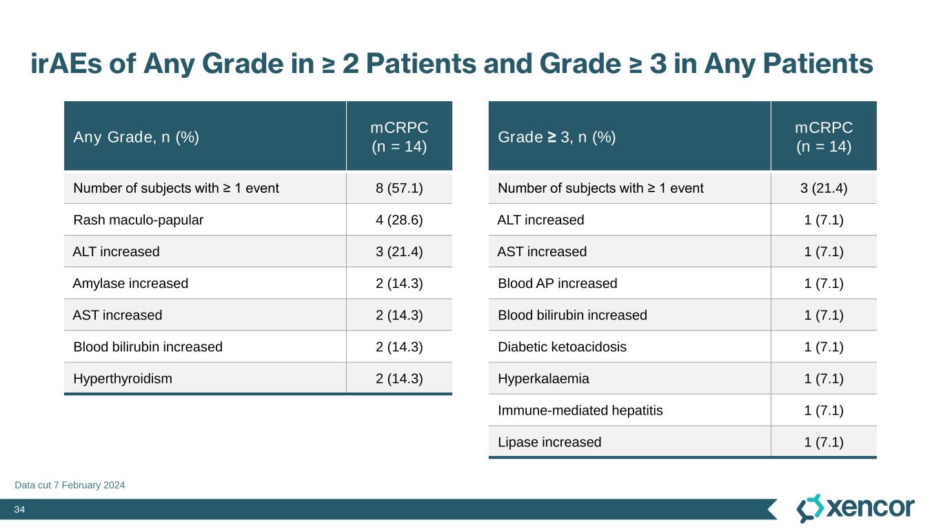 34 irAEs of Any Grade in ≥ 2 Patients and Grade ≥ 3 in Any Patients Any Grade, n (%) mCRPC (n = 14) Number of subjects with ≥ 1 event 8 (57.1) Rash maculo-papular 4 (28.6) ALT increased 3 (21.4) Amylase increased 2 (14.3) AST increased 2 (14.3) Blood bilirubin increased 2 (14.3) Hyperthyroidism 2 (14.3) Grade ≥ 3, n (%) mCRPC (n = 14) Number of subjects with ≥ 1 event 3 (21.4) ALT increased 1 (7.1) AST increased 1 (7.1) Blood AP increased 1 (7.1) Blood bilirubin increased 1 (7.1) Diabetic ketoacidosis 1 (7.1) Hyperkalaemia 1 (7.1) Immune-mediated hepatitis 1 (7.1) Lipase increased 1 (7.1) Data cut 7 February 2024