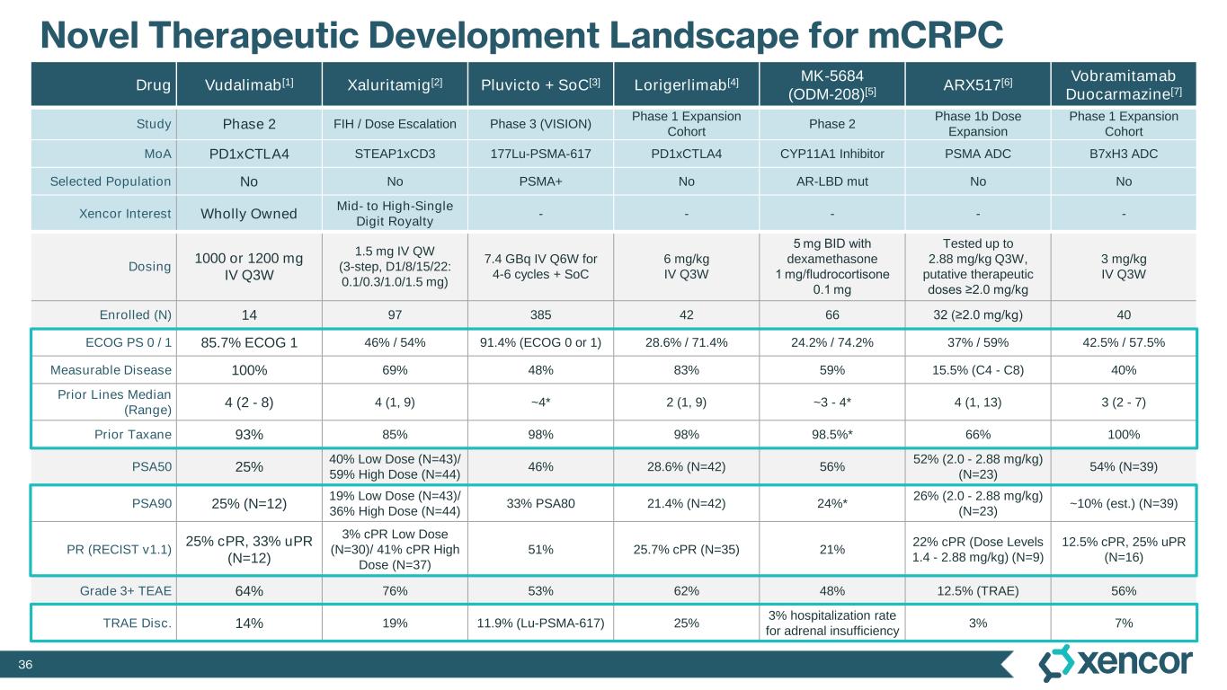 36 Novel Therapeutic Development Landscape for mCRPC Drug Vudalimab[1] Xaluritamig[2] Pluvicto + SoC[3] Lorigerlimab[4] MK-5684 (ODM-208)[5] ARX517[6] Vobramitamab Duocarmazine[7] Study Phase 2 FIH / Dose Escalation Phase 3 (VISION) Phase 1 Expansion Cohort Phase 2 Phase 1b Dose Expansion Phase 1 Expansion Cohort MoA PD1xCTLA4 STEAP1xCD3 177Lu-PSMA-617 PD1xCTLA4 CYP11A1 Inhibitor PSMA ADC B7xH3 ADC Selected Population No No PSMA+ No AR-LBD mut No No Xencor Interest Wholly Owned Mid- to High-Single Digit Royalty - - - - - Dosing 1000 or 1200 mg IV Q3W 1.5 mg IV QW (3-step, D1/8/15/22: 0.1/0.3/1.0/1.5 mg) 7.4 GBq IV Q6W for 4-6 cycles + SoC 6 mg/kg IV Q3W 5 mg BID with dexamethasone 1 mg/fludrocortisone 0.1 mg Tested up to 2.88 mg/kg Q3W, putative therapeutic doses ≥2.0 mg/kg 3 mg/kg IV Q3W Enrolled (N) 14 97 385 42 66 32 (≥2.0 mg/kg) 40 ECOG PS 0 / 1 85.7% ECOG 1 46% / 54% 91.4% (ECOG 0 or 1) 28.6% / 71.4% 24.2% / 74.2% 37% / 59% 42.5% / 57.5% Measurable Disease 100% 69% 48% 83% 59% 15.5% (C4 - C8) 40% Prior Lines Median (Range) 4 (2 - 8) 4 (1, 9) ~4* 2 (1, 9) ~3 - 4* 4 (1, 13) 3 (2 - 7) Prior Taxane 93% 85% 98% 98% 98.5%* 66% 100% PSA50 25% 40% Low Dose (N=43)/ 59% High Dose (N=44) 46% 28.6% (N=42) 56% 52% (2.0 - 2.88 mg/kg) (N=23) 54% (N=39) PSA90 25% (N=12) 19% Low Dose (N=43)/ 36% High Dose (N=44) 33% PSA80 21.4% (N=42) 24%* 26% (2.0 - 2.88 mg/kg) (N=23) ~10% (est.) (N=39) PR (RECIST v1.1) 25% cPR, 33% uPR (N=12) 3% cPR Low Dose (N=30)/ 41% cPR High Dose (N=37) 51% 25.7% cPR (N=35) 21% 22% cPR (Dose Levels 1.4 - 2.88 mg/kg) (N=9) 12.5% cPR, 25% uPR (N=16) Grade 3+ TEAE 64% 76% 53% 62% 48% 12.5% (TRAE) 56% TRAE Disc. 14% 19% 11.9% (Lu-PSMA-617) 25% 3% hospitalization rate for adrenal insufficiency 3% 7%