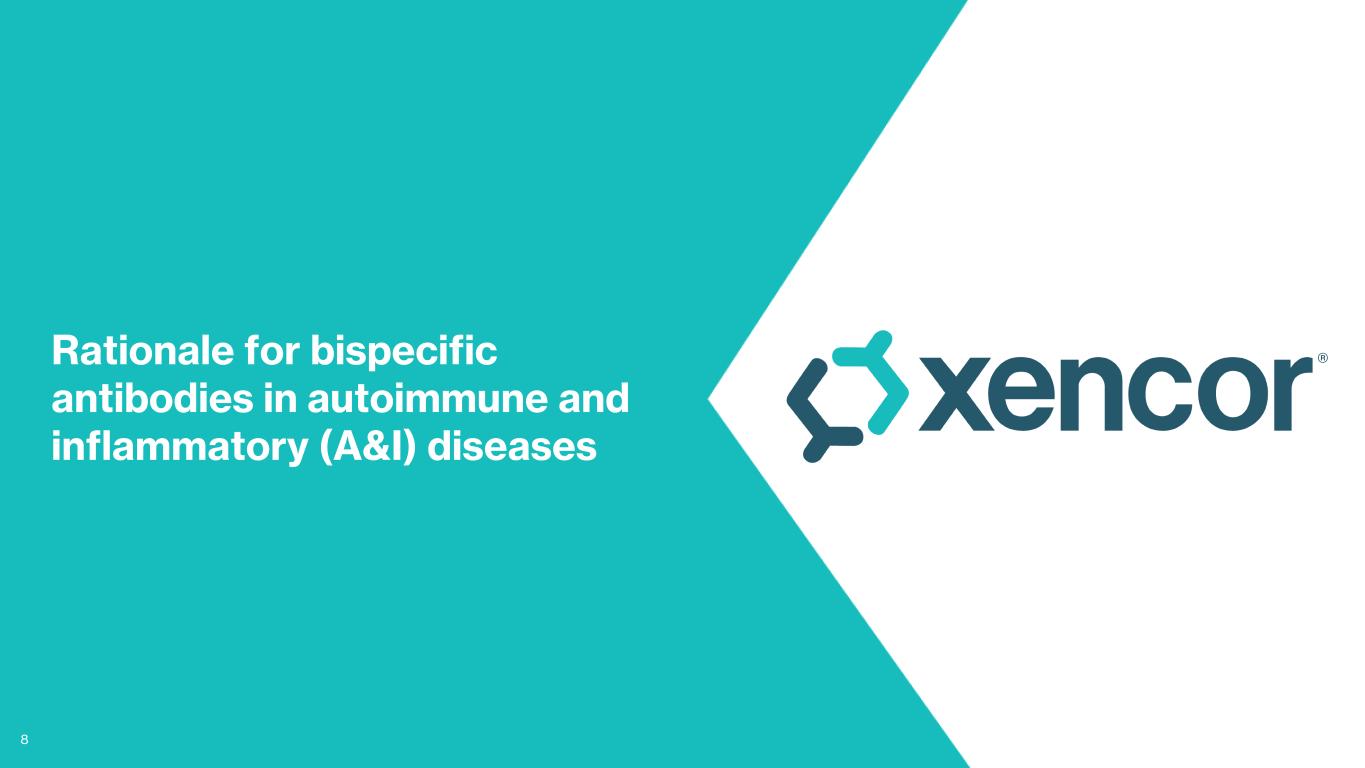 7 Rebalanced Portfolio Optimized for XmAb® Drug Development Validated targets across autoimmune disease, leveraging XmAb engineering Engineering Complexity Biological Uncertainty DiscontinuedNew Clinical Stage CD20 x CD3 Plamotamab Xtend TL1A XmAb942 Oncology CD28 TCEs PD1 x ICOS XmAb104 PD1 x CTLA4 Vudalimab Autoimmune Portfolio TL1A x IL23 Oncology CD3 TCEs Engineered Cytokines CD19 x CD3 XmAb657 CLDN6 x CD3 XmAb541 ENPP3 x CD3 XmAb819 IL12-Fc XmAb662 IL2-Fc (Treg) XmAb564 Key
