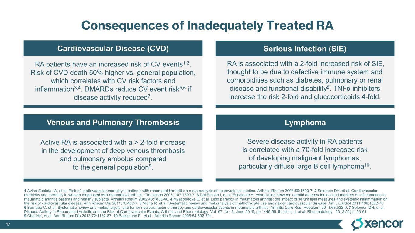 17 RA patients have an increased risk of CV events1,2. Risk of CVD death 50% higher vs. general population, which correlates with CV risk factors and inflammation3,4. DMARDs reduce CV event risk5,6 if disease activity reduced7. Severe disease activity in RA patients is correlated with a 70-fold increased risk of developing malignant lymphomas, particularly diffuse large B cell lymphoma10. RA is associated with a 2-fold increased risk of SIE, thought to be due to defective immune system and comorbidities such as diabetes, pulmonary or renal disease and functional disability8. TNFα inhibitors increase the risk 2-fold and glucocorticoids 4-fold. Active RA is associated with a > 2-fold increase in the development of deep venous thrombosis and pulmonary embolus compared to the general population9. Consequences of Inadequately Treated RA Cardiovascular Disease (CVD) Serious Infection (SIE) Venous and Pulmonary Thrombosis Lymphoma 1 Avina-Zubieta JA, et al. Risk of cardiovascular mortality in patients with rheumatoid arthritis: a meta-analysis of observational studies. Arthritis Rheum 2008;59:1690-7. 2 Solomon DH, et al. Cardiovascular morbidity and mortality in women diagnosed with rheumatoid arthritis. Circulation 2003; 107:1303-7. 3 Del Rincon I, et al. Escalante A. Association between carotid atherosclerosis and markers of inflammation in rheumatoid arthritis patients and healthy subjects. Arthritis Rheum 2002;48:1833-40. 4 Myasoedova E, et al. Lipid paradox in rheumatoid arthritis: the impact of serum lipid measures and systemic inflammation on the risk of cardiovascular disease. Ann Rheum Dis 2011;70:482-7. 5 Micha R, et al. Systematic review and metaanalysis of methotrexate use and risk of cardiovascular disease. Am J Cardiol 2011;108:1362-70. 6 Barnabe C, et al. Systematic review and metaanalysis: anti-tumor necrosis factor a therapy and cardiovascular events in rheumatoid arthritis. Arthritis Care Res (Hoboken) 2011;63:522-9. 7 Solomon DH, et al, Disease Activity in Rheumatoid Arthritis and the Risk of Cardiovascular Events. Arthritis and Rheumatology. Vol. 67, No. 6, June 2015, pp 1449-55. 8 Listing J, et al. Rheumatology, 2013 52(1): 53-61. 9 Choi HK, et al. Ann Rheum Dis 2013;72:1182-87. 10 Baecklund E, et al. Arthritis Rheum 2006;54:692-701.