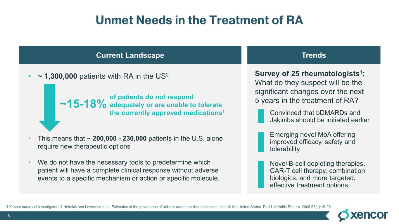 18 Unmet Needs in the Treatment of RA Current Landscape Trends • ~ 1,300,000 patients with RA in the US2 • This means that ~ 200,000 - 230,000 patients in the U.S. alone require new therapeutic options • We do not have the necessary tools to predetermine which patient will have a complete clinical response without adverse events to a specific mechanism or action or specific molecule. Survey of 25 rheumatologists1: What do they suspect will be the significant changes over the next 5 years in the treatment of RA? Convinced that bDMARDs and Jakinibs should be initiated earlier Emerging novel MoA offering improved efficacy, safety and tolerability Novel B-cell depleting therapies, CAR-T cell therapy, combination biologics, and more targeted, effective treatment options 1 Xencor survey of investigators 2 Helmick and Lawrence et al; Estimates of the prevalence of arthritis and other rheumatic conditions in the United States. Part I. Arthritis Rheum. 2008;58(1):15-25 of patients do not respond adequately or are unable to tolerate the currently approved medications1 ~15-18%