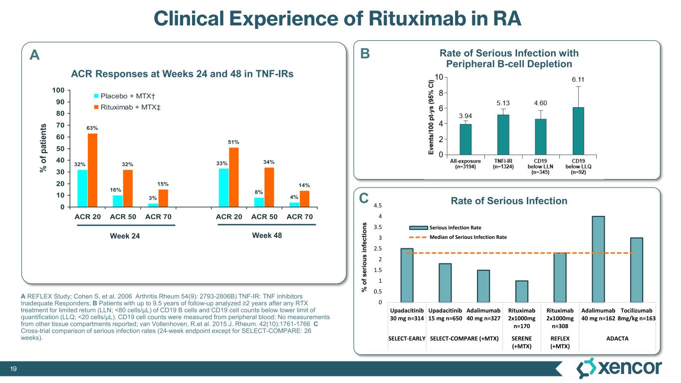 19 0 0.5 1 1.5 2 2.5 3 3.5 4 4.5 Upadacitinib 30 mg n=314 Upadacitinib 15 mg n=650 Adalimumab 40 mg n=327 Rituximab 2x1000mg n=170 Rituximab 2x1000mg n=308 Adalimumab 40 mg n=162 Tocilizumab 8mg/kg n=163 SELECT-EARLY SELECT-COMPARE (+MTX) SERENE (+MTX) REFLEX (+MTX) ADACTA Serious Infection Rate Median of Serious Infection Rate ACR Responses at Weeks 24 and 48 in TNF-IRs A REFLEX Study; Cohen S, et al. 2006 Arthritis Rheum 54(9): 2793-2806B) TNF-IR: TNF inhibitors Inadequate Responders; B Patients with up to 9.5 years of follow-up analyzed ≥2 years after any RTX treatment for limited return (LLN; <80 cells/μL) of CD19 B cells and CD19 cell counts below lower limit of quantification (LLQ; <20 cells/μL). CD19 cell counts were measured from peripheral blood; No measurements from other tissue compartments reported; van Vollenhoven, R.et al. 2015 J. Rheum. 42(10):1761-1766 C Cross-trial comparison of serious infection rates (24-week endpoint except for SELECT-COMPARE: 26 weeks). Clinical Experience of Rituximab in RA Week 24 Week 48 Rate of Serious Infection with Peripheral B-cell Depletion A % o f s er io us in fe ct io ns Rate of Serious Infection 32% 16% 3% 33% 8% 4% 63% 32% 15% 51% 34% 14% 0 10 20 30 40 50 60 70 80 90 100 ACR 20 ACR 50 ACR 70 ACR 20 ACR 50 ACR 70 % o f p at ie nt s Placebo + MTX† Rituximab + MTX‡ B C
