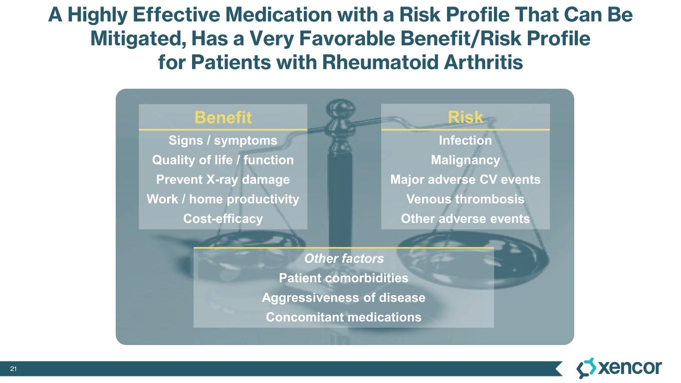 21 A Highly Effective Medication with a Risk Profile That Can Be Mitigated, Has a Very Favorable Benefit/Risk Profile for Patients with Rheumatoid Arthritis Benefit Risk Infection Malignancy Major adverse CV events Venous thrombosis Other adverse events Signs / symptoms Quality of life / function Prevent X-ray damage Work / home productivity Cost-efficacy Other factors Patient comorbidities Aggressiveness of disease Concomitant medications
